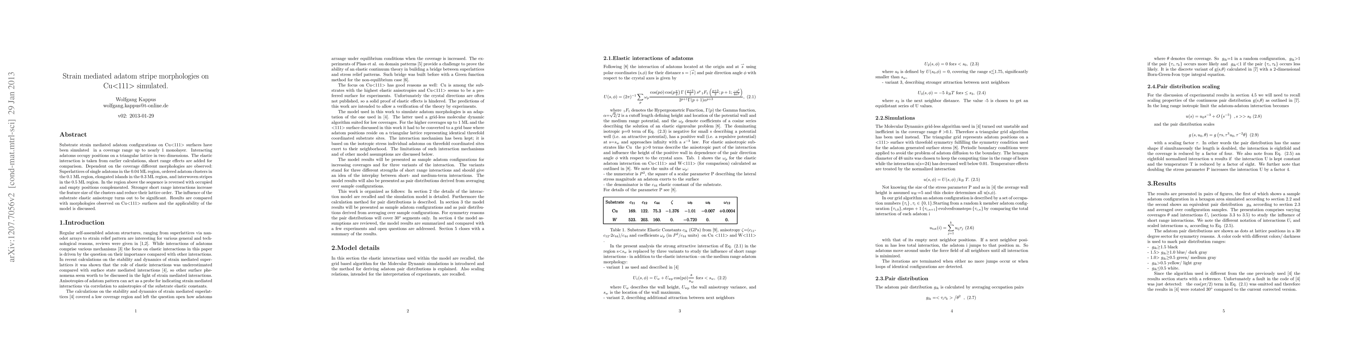 The paper presents a detailed simulation study of strain-mediated adatom configurations on Cu<111> surfaces, deriving pair distributions to prove morphologies from single-atom superlattices to ordered stress domain patterns.