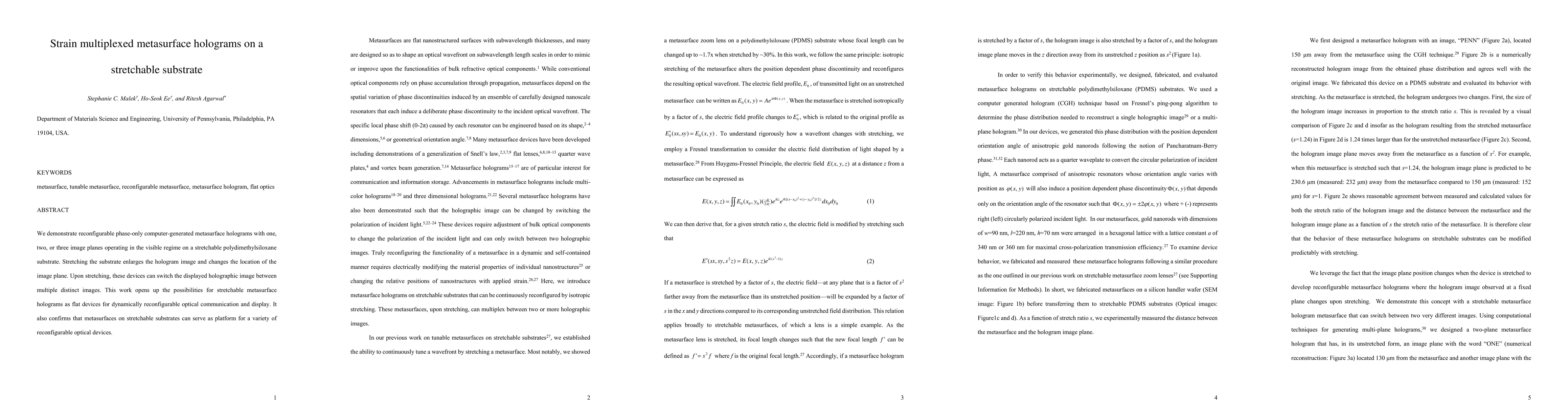 This paper presents reconfigurable metasurface holograms on a stretchable substrate that can display multiple images by altering the substrate's shape, demonstrating potential for dynamic optical communication and display applications. The study confirms the viability of stretchable substrates for creating versatile reconfigurable optical devices.