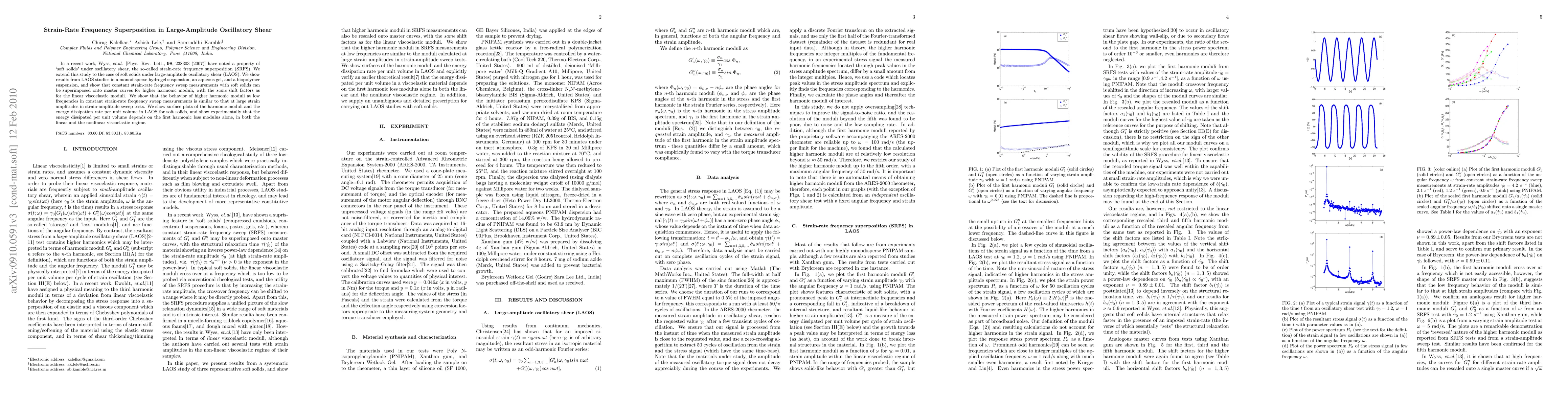 This paper extends the strain-rate frequency superposition (SRFS) concept to large-amplitude oscillatory shear (LAOS) in soft solids, demonstrating that SRFS measurements can be superimposed onto master curves for higher harmonic moduli using the same shift factors as for linear viscoelastic moduli. The study shows that energy dissipation in LAOS is primarily dependent on the first harmonic loss modulus.