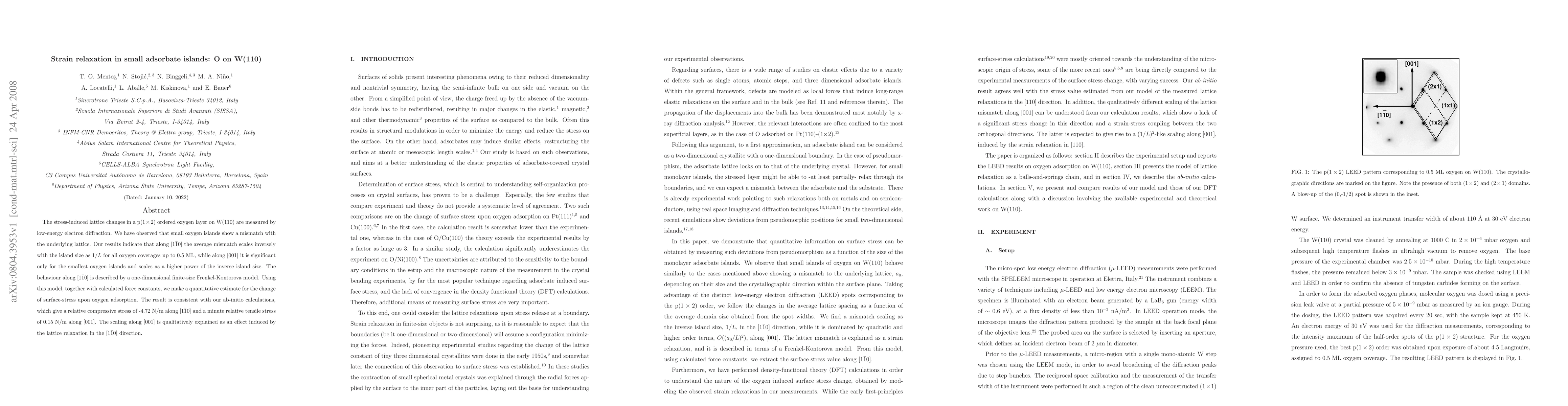 Researchers studied stress-induced lattice changes on a W(110) surface with a p(1x2) ordered oxygen layer and found that small islands show mismatch with the underlying lattice, scaling inversely with island size.