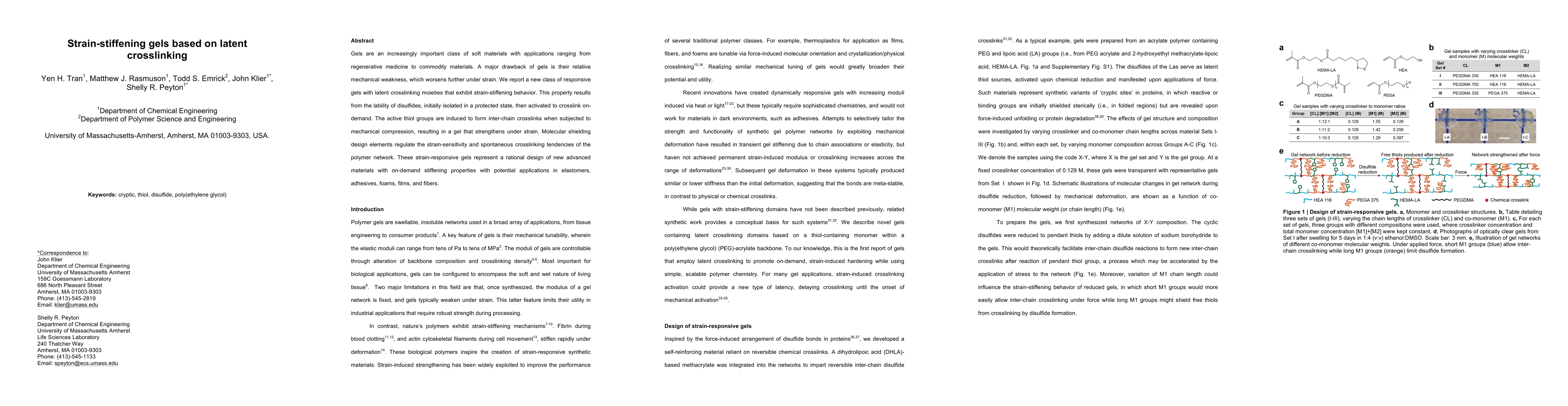 This paper introduces a novel class of strain-stiffening gels with latent crosslinking moieties that activate under mechanical stress, improving their mechanical strength. The gels utilize disulfide bonds that form inter-chain crosslinks upon compression, offering potential applications in advanced materials like elastomers and adhesives.