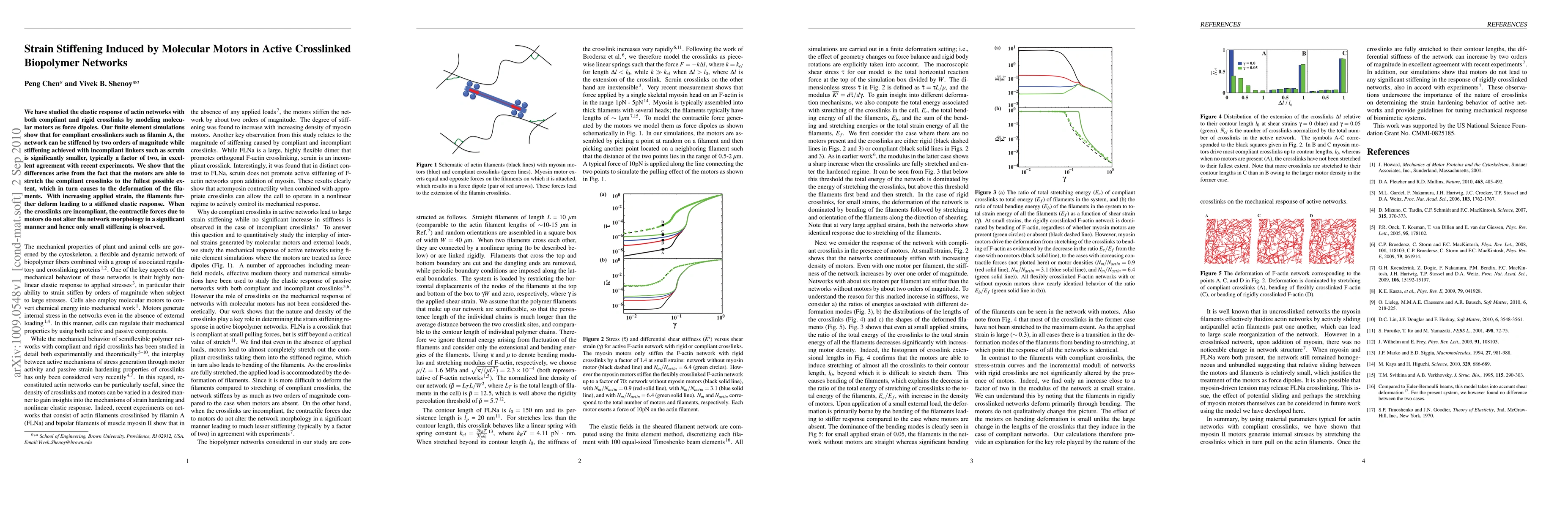 We have studied the elastic response of actin networks with both compliant and rigid crosslinks by modeling molecular motors as force dipoles. Our finite element simulations show that for compliant crosslinkers such as filamin A, the network can be stiffened by two orders of magnitude while stiffening achieved with incompliant linkers such as scruin is significantly smaller, typically a factor of two, in excellent agreement with recent experiments. We show that the differences arise from the fact that the motors are able to stretch the compliant crosslinks to the fullest possible extent, which in turn causes to the deformation of the filaments. With increasing applied strain, the filaments further deform leading to a stiffened elastic response. When the crosslinks are incompliant, the contractile forces due to motors do not alter the network morphology in a significant manner and hence only small stiffening is observed.