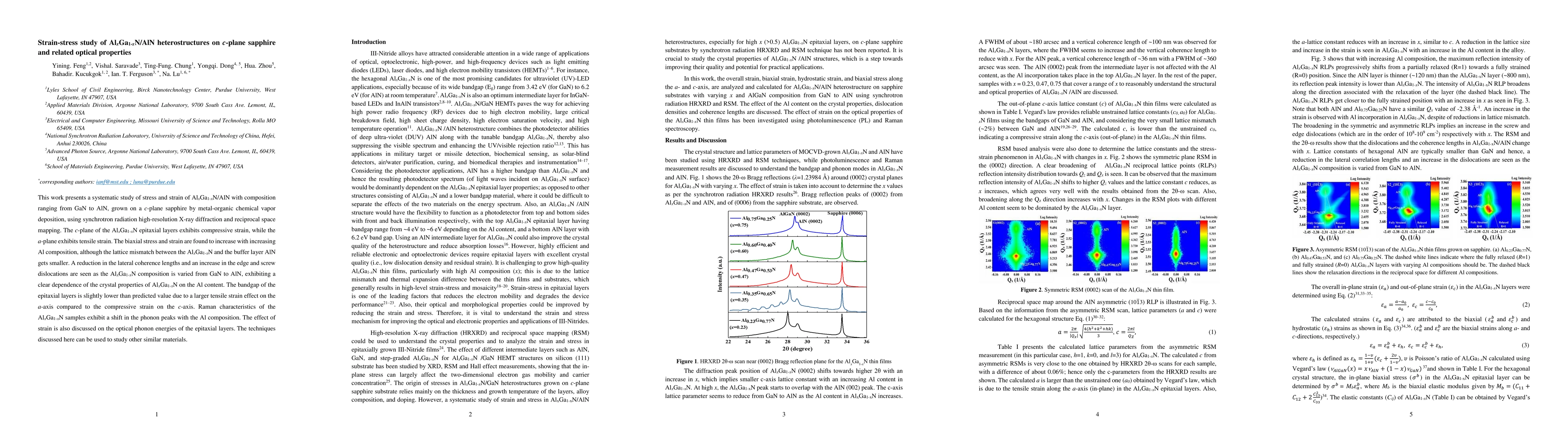 This study investigates the strain and stress in AlxGa1-xN/AlN heterostructures grown on c-plane sapphire, revealing compressive strain on the c-plane and tensile strain on the a-plane, with stress and strain increasing with higher Al content. The optical properties show a shift in phonon peaks and a lower bandgap due to strain effects.