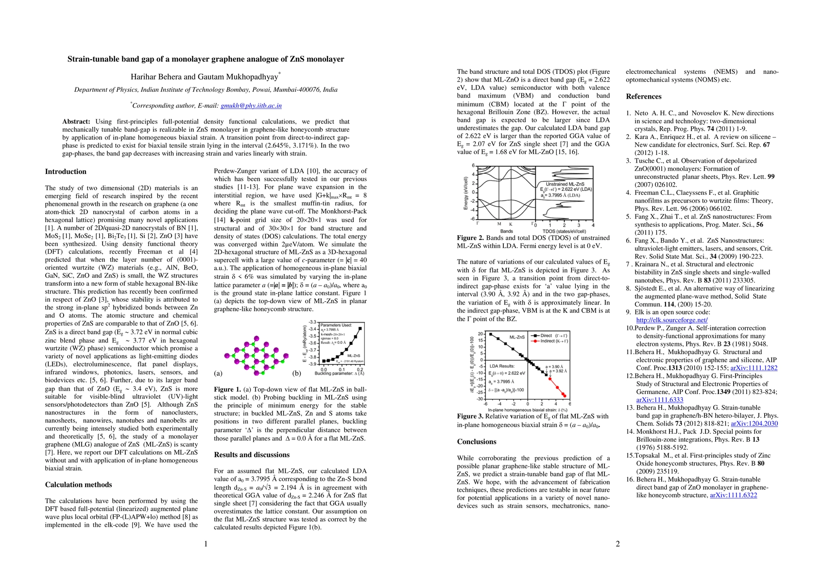 Summary: First-principles calculations predict that a mechanically tunable band gap is achievable in a graphene-like ZnS monolayer through in-plane biaxial strain, with a transition from direct to indirect band gap occurring between 2.645% and 3.171% tensile strain. The band gap varies linearly with strain in both phases.