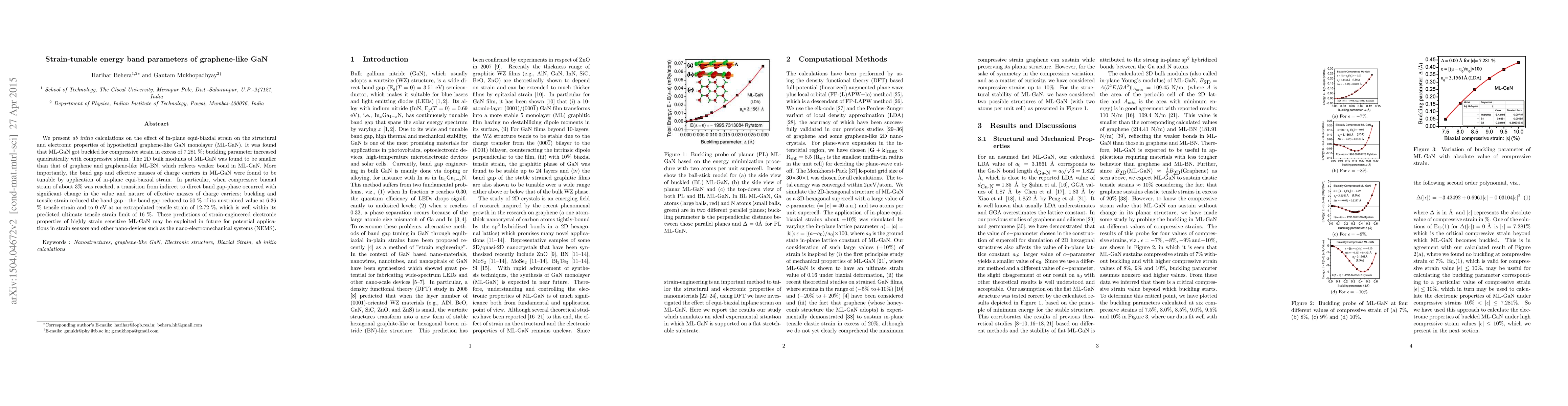 This paper reports ab initio calculations showing that in-plane equi-biaxial strain can tune the energy band parameters of graphene-like GaN, including a transition from indirect to direct band gap under compressive strain. The tunable band gap and effective masses suggest potential applications in strain sensors and nano-devices.