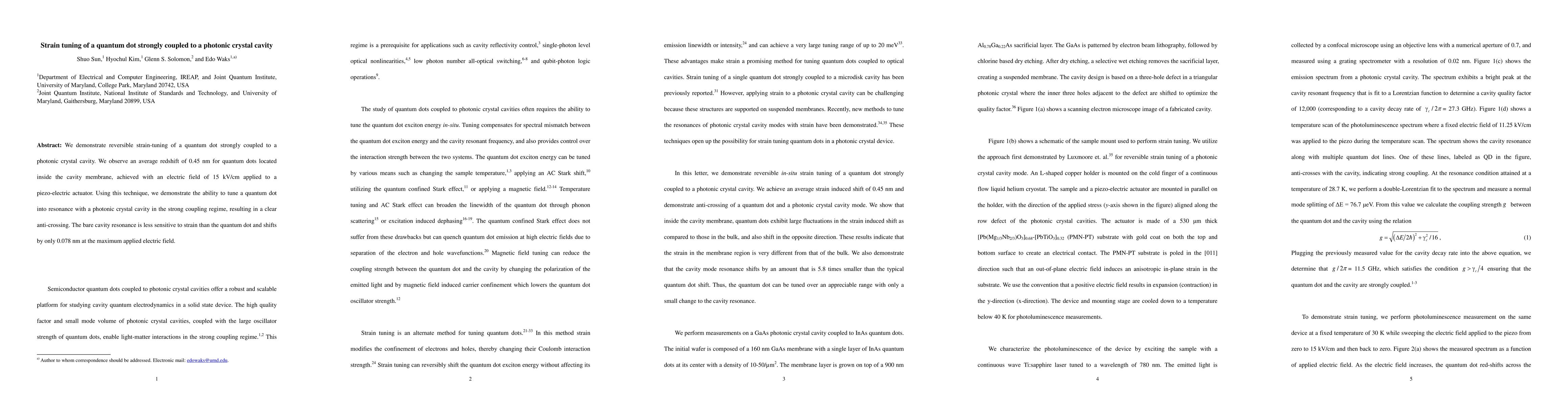 This study demonstrates reversible strain-tuning of a quantum dot coupled to a photonic crystal cavity, achieving a 0.45 nm redshift with an electric field of 15 kV/cm. The technique allows tuning the quantum dot into resonance with the cavity, showing strong coupling and clear anti-crossing.