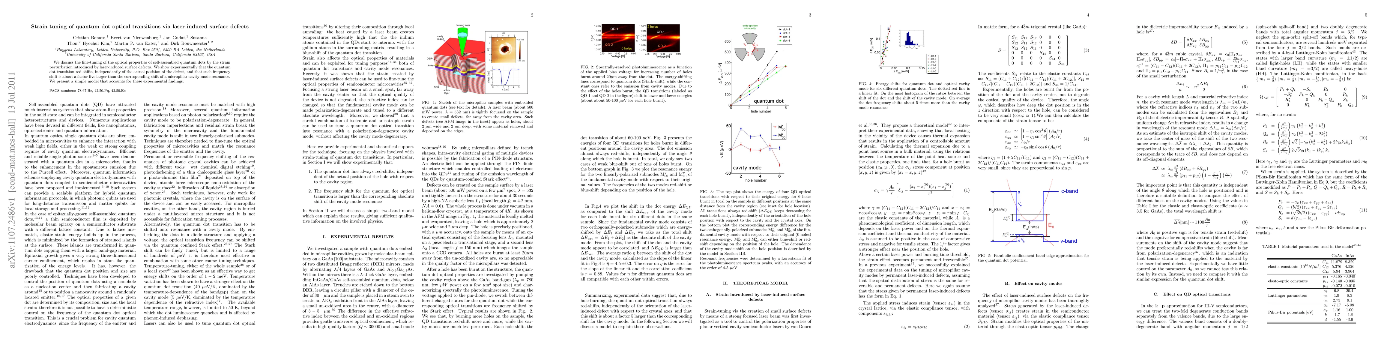 This paper investigates how laser-induced surface defects can strain self-assembled quantum dots, leading to a significant red-shift in their optical transitions. Experimental results show a frequency shift five times larger than that of a micropillar cavity mode, supported by a theoretical model.