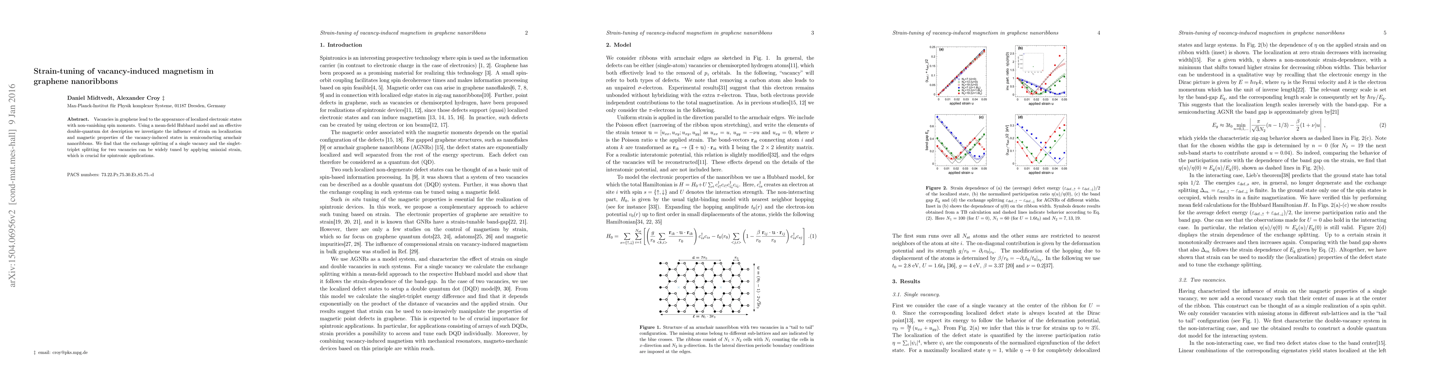 This paper investigates how strain affects vacancy-induced magnetism in graphene nanoribbons, revealing that uniaxial strain can widely tune the exchange splitting and singlet-triplet splitting, which is vital for potential spintronic applications.