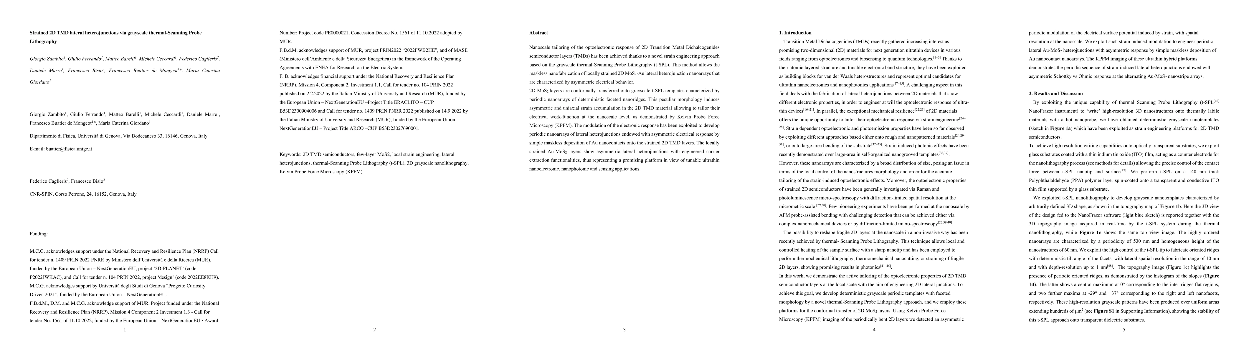 Nanoscale tailoring of the optoelectronic response of 2D Transition Metal Dichalcogenides semiconductor layers (TMDs) has been achieved thanks to a novel strain engineering approach based on the grayscale thermal-Scanning Probe Lithography (t-SPL). This method allows the maskless nanofabrication of locally strained 2D MoS2-Au lateral heterojunction nanoarrays that are characterized by asymmetric electrical behavior. 2D MoS2 layers are conformally transferred onto grayscale t-SPL templates characterized by periodic nanoarrays of deterministic faceted nanoridges. This peculiar morphology induces asymmetric and uniaxial strain accumulation in the 2D TMD material allowing to tailor their electrical work-function at the nanoscale level, as demonstrated by Kelvin Probe Force Microscopy (KPFM). The modulation of the electronic response has been exploited to develop periodic nanoarrays of lateral heterojunctions endowed with asymmetric electrical response by simple maskless deposition of Au nanocontacts onto the strained 2D TMD layers. The locally strained Au-MoS2 layers show asymmetric lateral heterojunctions with engineered carrier extraction functionalities, thus representing a promising platform in view of tunable ultrathin nanoelectronic, nanophotonic and sensing applications.
