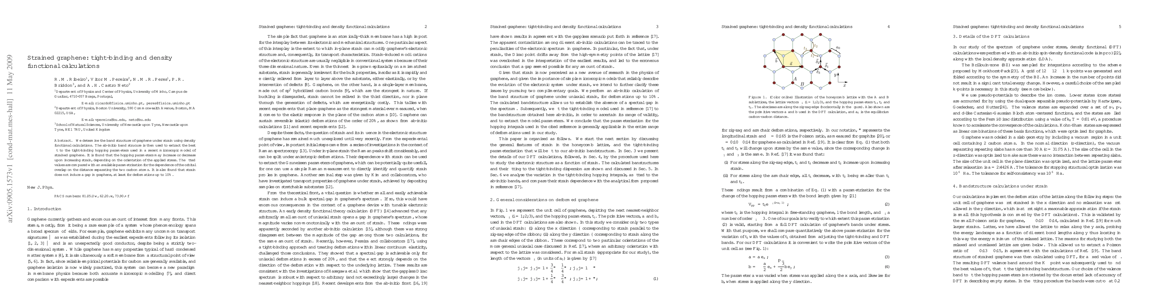 This paper investigates the band structure of strained graphene using density functional theory and tight-binding models, finding that strain can either increase or decrease hopping parameters depending on stress orientation, and confirming that strain does not induce a band gap in graphene up to 10% deformation.
