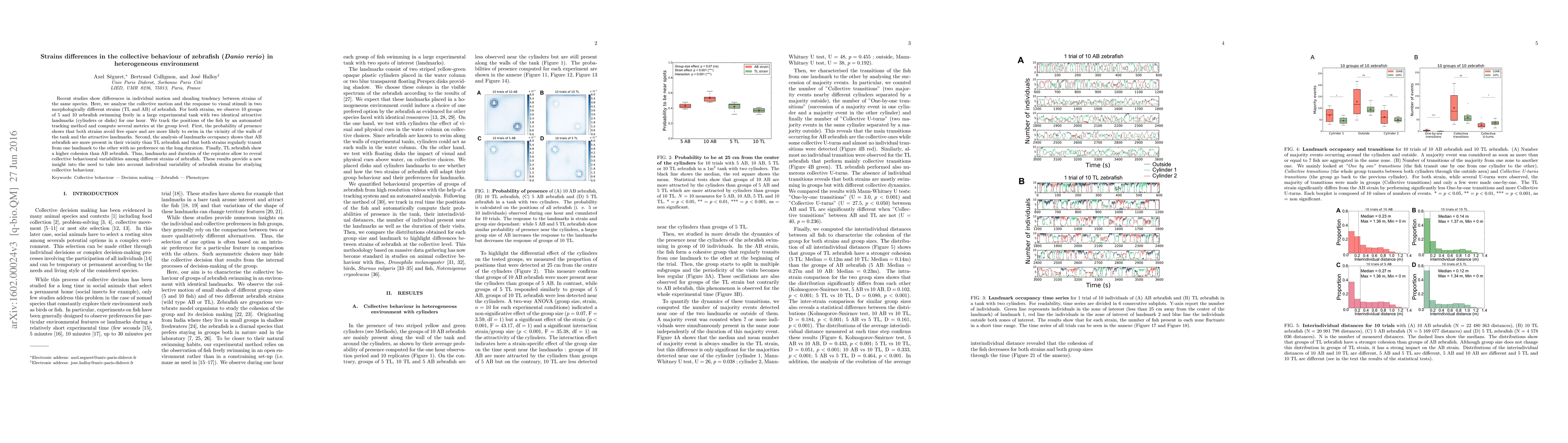 This study investigates the collective behaviour of two zebrafish strains (TL and AB) in a heterogeneous environment with visual stimuli. Results show that both strains prefer to swim near tank walls and attractive landmarks, with AB zebrafish more frequently occupying landmark areas. TL zebrafish exhibit higher cohesion compared to AB, highlighting individual strain variability in collective behaviour.