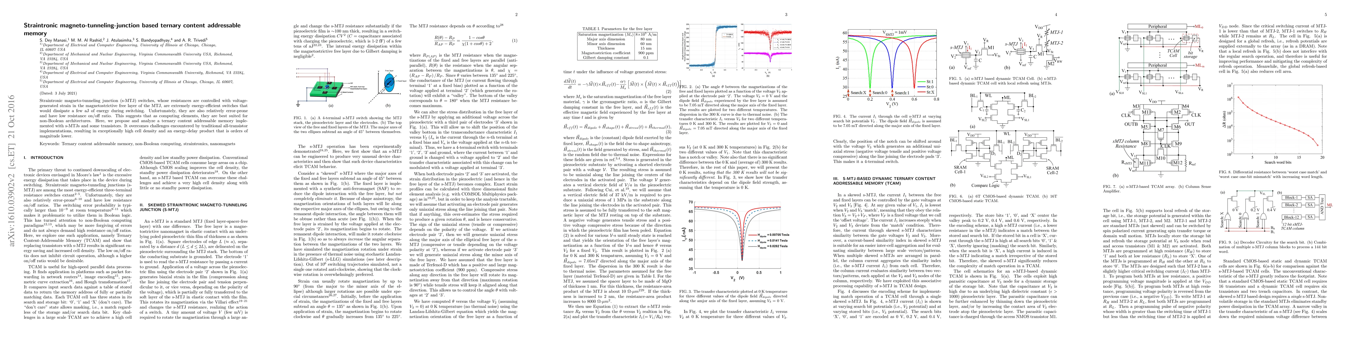 This paper proposes a ternary content addressable memory using straintronic magneto-tunneling junctions (s-MTJs) that leverages voltage-generated strain for energy-efficient switching, addressing the low resistance ratio and error-prone nature of s-MTJs by integrating them with transistors to achieve high cell density and non-Boolean computing capabilities.