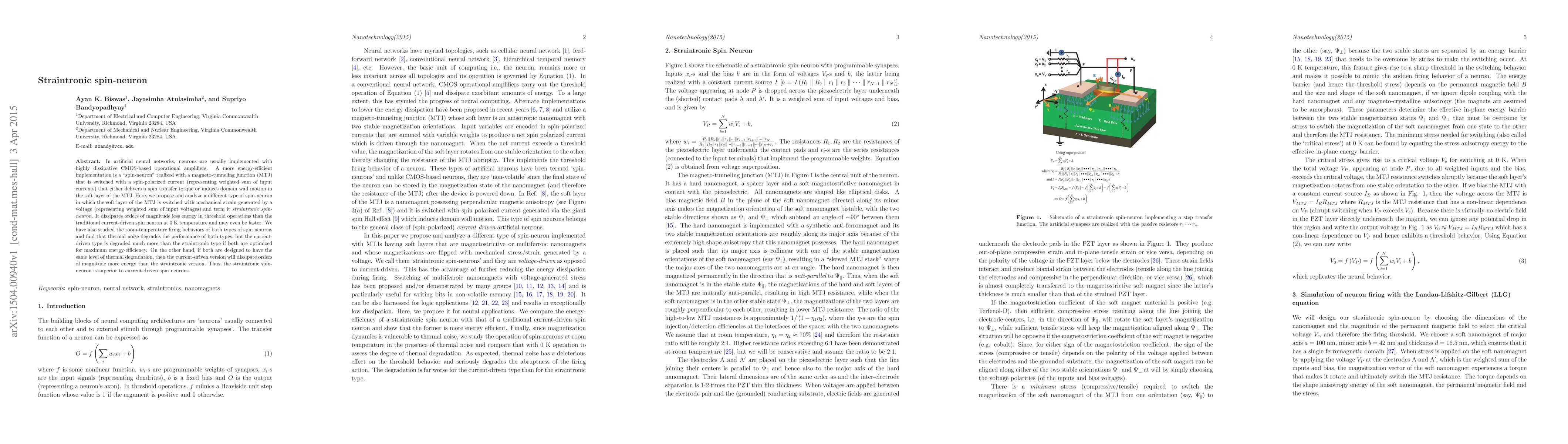 The paper proposes a straintronic spin-neuron, an energy-efficient alternative to traditional CMOS-based neural networks, which uses mechanical strain instead of spin-polarized current to switch a magneto-tunneling junction. The straintronic spin-neuron dissipates significantly less energy and is more resilient to thermal noise compared to current-driven spin neurons.