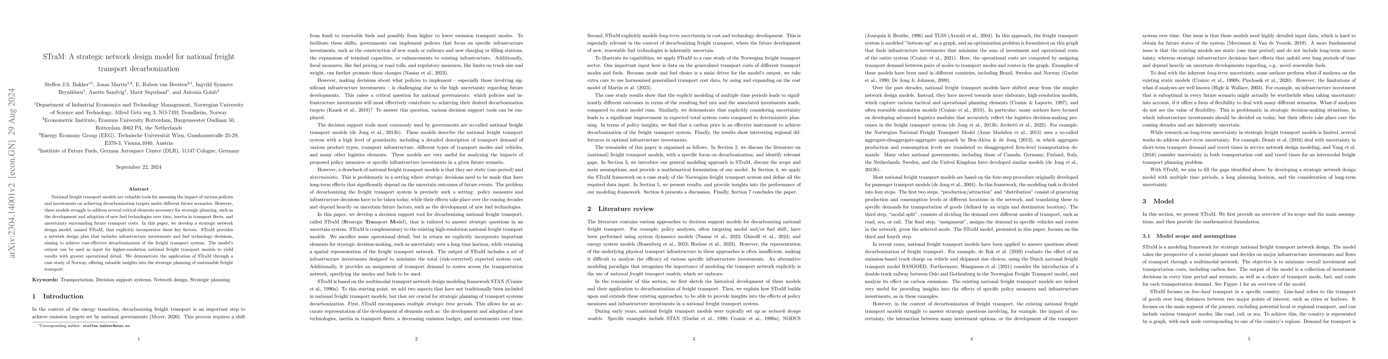 This paper introduces STraM, a strategic national freight transport modeling framework that addresses the limitations of existing static models by incorporating dynamic long-term planning, low-carbon fuel technologies, and uncertainties in technology development. The model is demonstrated through a case study of Norway, highlighting the importance of multi-period planning and carbon pricing for decarbonization.