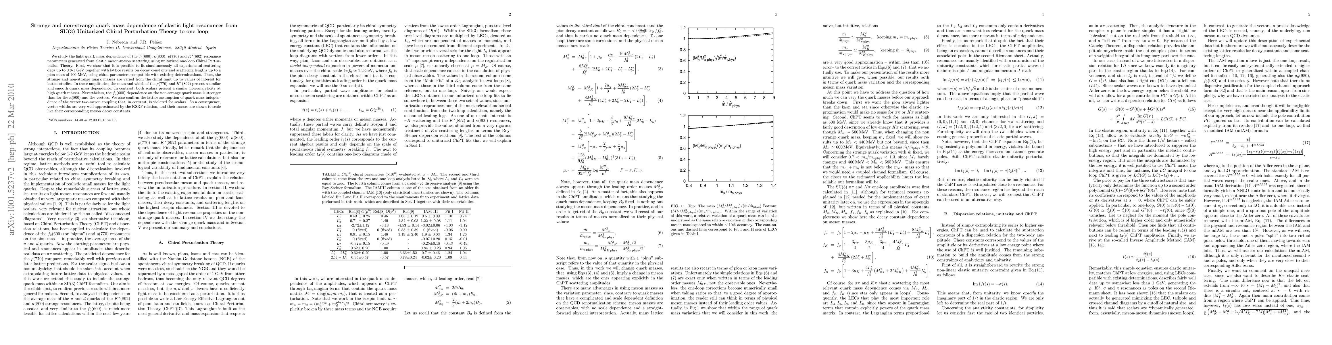 This paper investigates the quark mass dependence of elastic light meson resonances using unitarized one-loop Chiral Perturbation Theory. It finds that the rho(770) and K*(892) resonances exhibit smooth quark mass dependence, while scalars like f_0(600) and kappa(800) show stronger non-strange quark mass effects and non-analyticity at high quark masses.