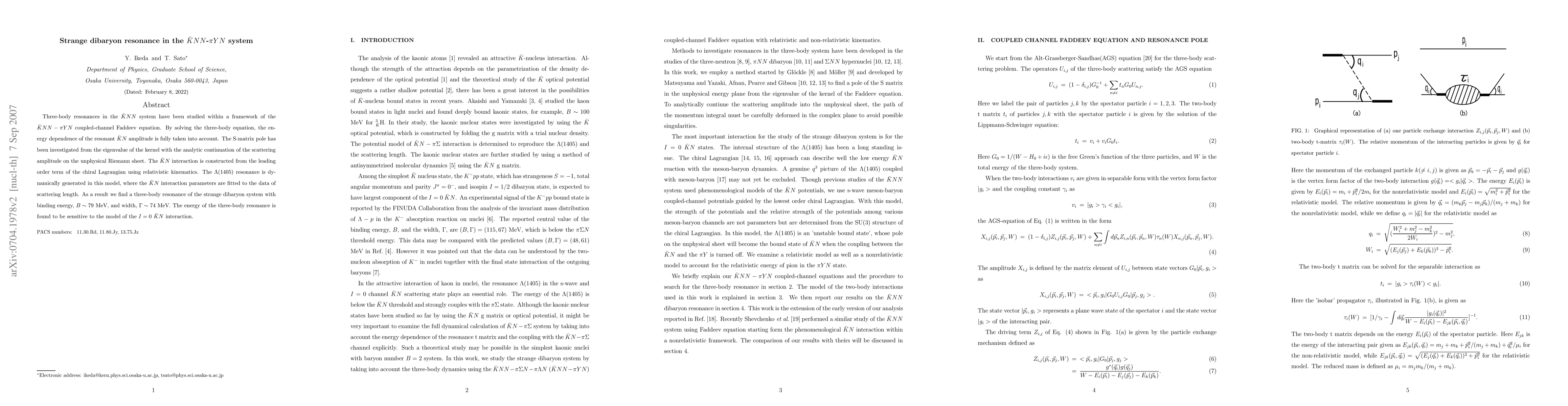 This paper investigates a three-body resonance in the anti-KNN-piYN system using the \bar{K}NN-\pi YN coupled channel Faddeev equation, revealing a strange dibaryon resonance with a binding energy of ~79 MeV and width ~74 MeV. The resonance is dynamically generated from the \bar{K}N interaction, fitted to scattering length data.