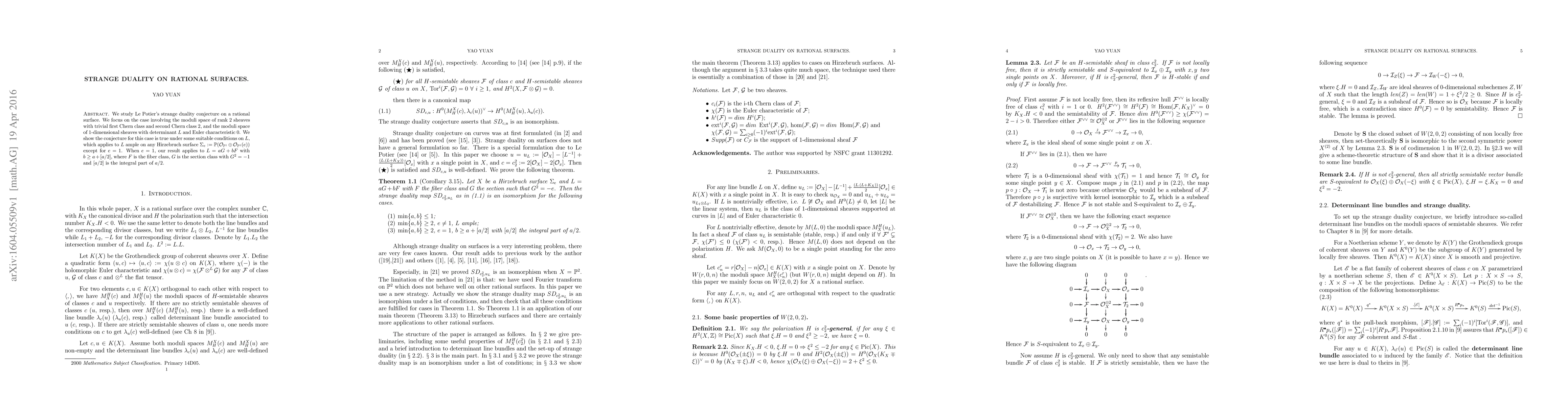 The paper confirms Le Potier's strange duality conjecture for a specific case involving rank 2 sheaves on rational surfaces, showing validity under certain conditions on the ample line bundle $L$, which generally applies to Hirzebruch surfaces except for $e=1$. Special cases for $e=1$ involve $L=aG+bF$ with $b\geq a+[a/2]$.