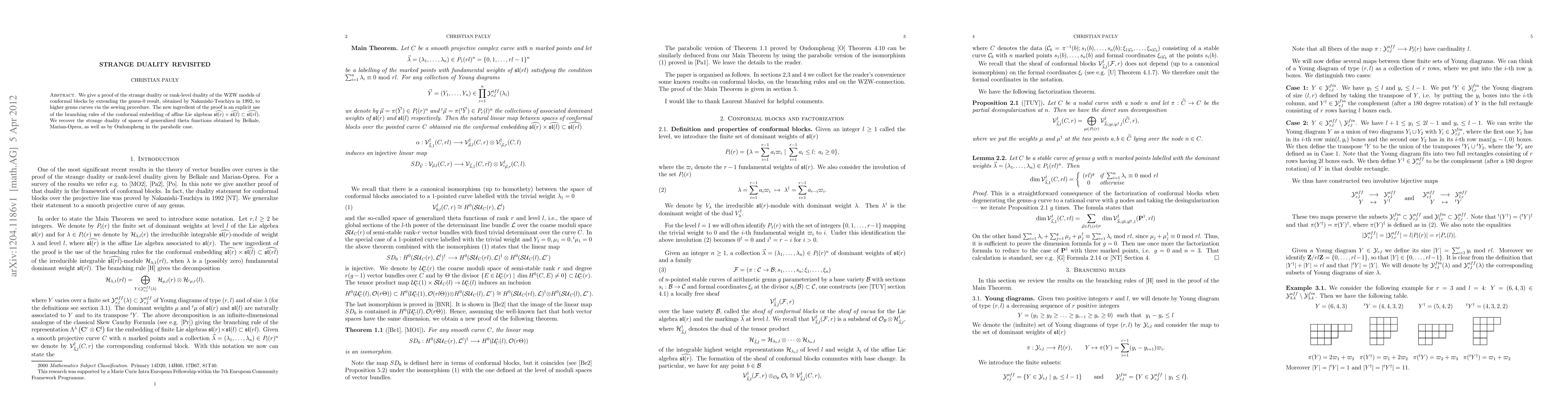 This paper proves the strange duality in WZW conformal blocks by extending the genus-0 result to higher genus curves using the sewing procedure, incorporating branching rules of affine Lie algebras. It also recovers the duality for generalized theta functions in both general and parabolic cases.