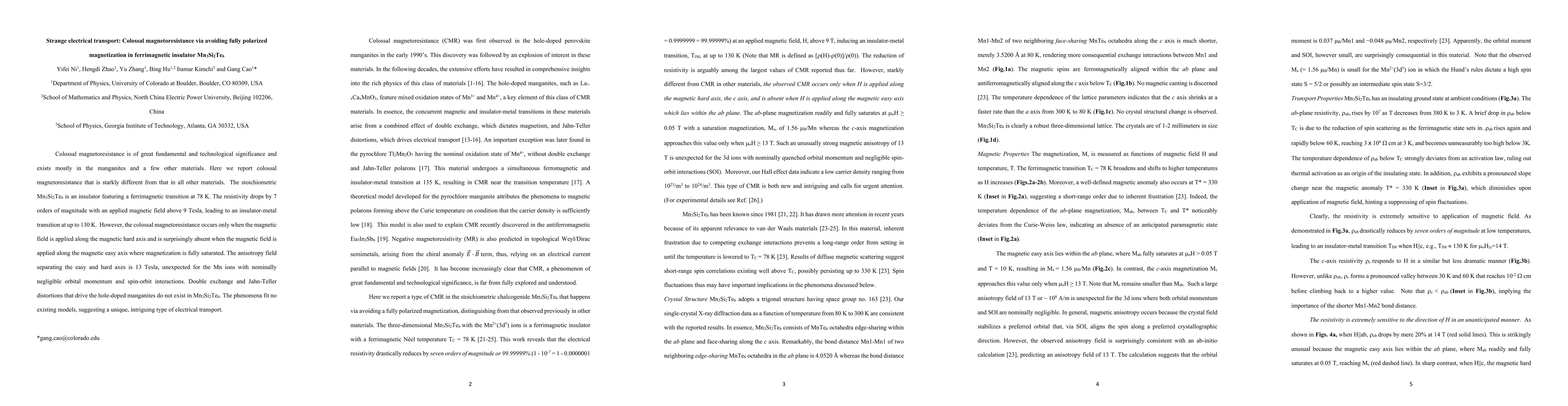 Colossal magnetoresistance is of great fundamental and technological significance and exists mostly in the manganites and a few other materials. Here we report colossal magnetoresistance that is starkly different from that in all other materials. The stoichiometric Mn3Si2Te6 is an insulator featuring a ferrimagnetic transition at 78 K. The resistivity drops by 7 orders of magnitude with an applied magnetic field above 9 Tesla, leading to an insulator-metal transition at up to 130 K. However, the colossal magnetoresistance occurs only when the magnetic field is applied along the magnetic hard axis and is surprisingly absent when the magnetic field is applied along the magnetic easy axis where magnetization is fully saturated. The anisotropy field separating the easy and hard axes is 13 Tesla, unexpected for the Mn ions with nominally negligible orbital momentum and spin-orbit interactions. Double exchange and Jahn-Teller distortions that drive the hole-doped manganites do not exist in Mn3Si2Te6. The phenomena fit no existing models, suggesting a unique, intriguing type of electrical transport.