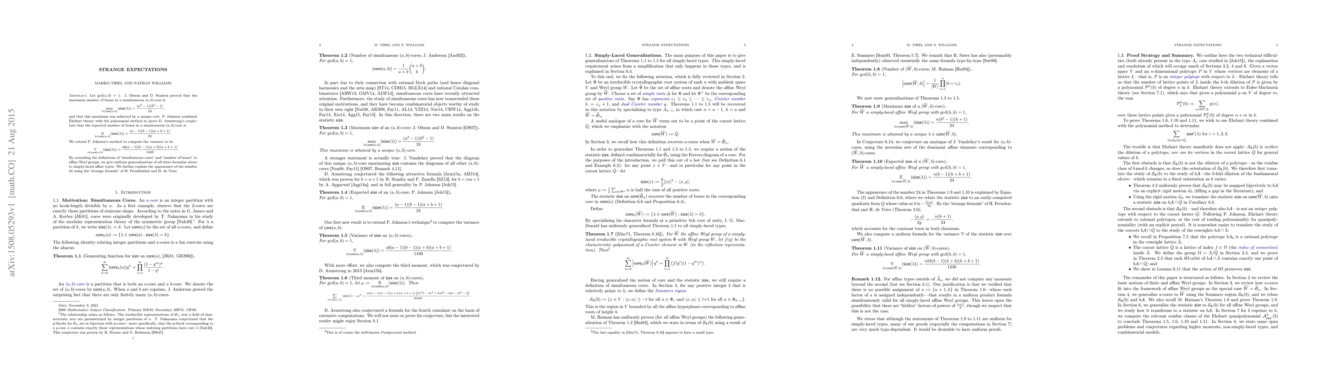 Let gcd(a,b)=1. J. Olsson and D. Stanton proved that the maximum number of boxes in a simultaneous (a,b)-core is (a^2-1)(b^2-1)/24, and that this maximum was achieved by a unique core. P. Johnson combined Ehrhart theory with the polynomial method to prove D. Armstrong's conjecture that the expected number of boxes in a simultaneous (a,b)-core is (a-1)(b-1)(a+b+1)/24. We extend P. Johnson's method to compute the variance to be ab(a-1)(b-1)(a+b)(a+b+1)/1440. By extending the definitions of "simultaneous cores" and "number of boxes" to affine Weyl groups, we give uniform generalizations of all three formulae above to simply-laced affine types. We further explain the appearance of the number 24 using the "strange formula" of H. Freudenthal and H. de Vries.