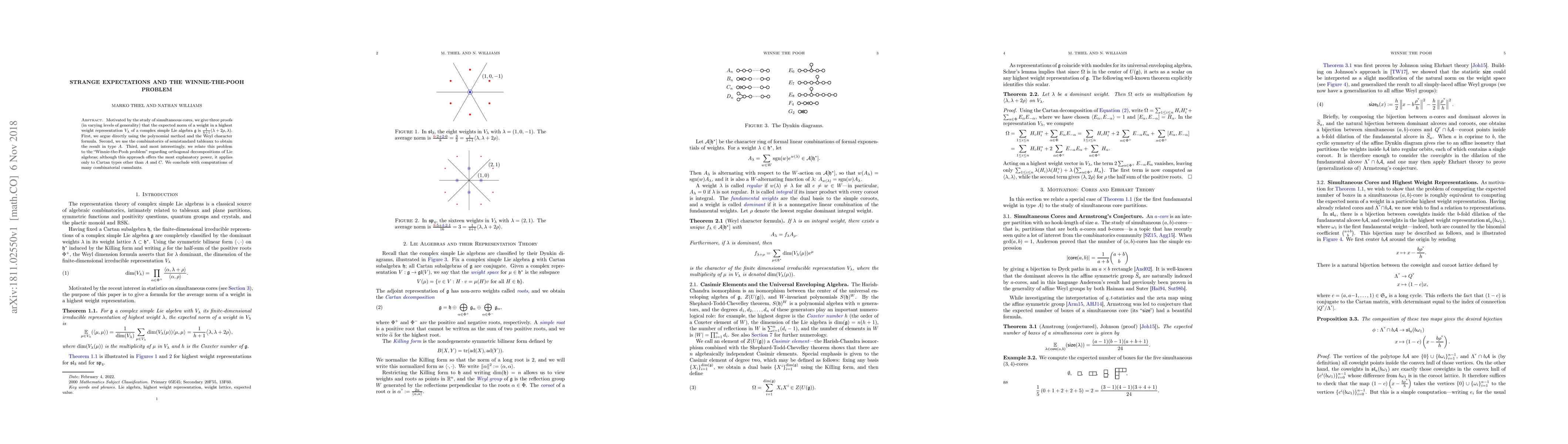 Motivated by the study of simultaneous cores, we give three proofs (in varying levels of generality) for the expected norm of a weight in a highest weight representation of a complex simple Lie algebra. First, we argue directly using the polynomial method and the Weyl character formula. Second, we use the combinatorics of semistandard tableaux to obtain the result in type A. Third, and most interestingly, we relate this problem to the "Winnie-the-Pooh problem" regarding orthogonal decompositions of Lie algebras; although this approach offers the most explanatory power, it applies only to Cartan types other than A and C. We conclude with computations of many combinatorial cumulants.