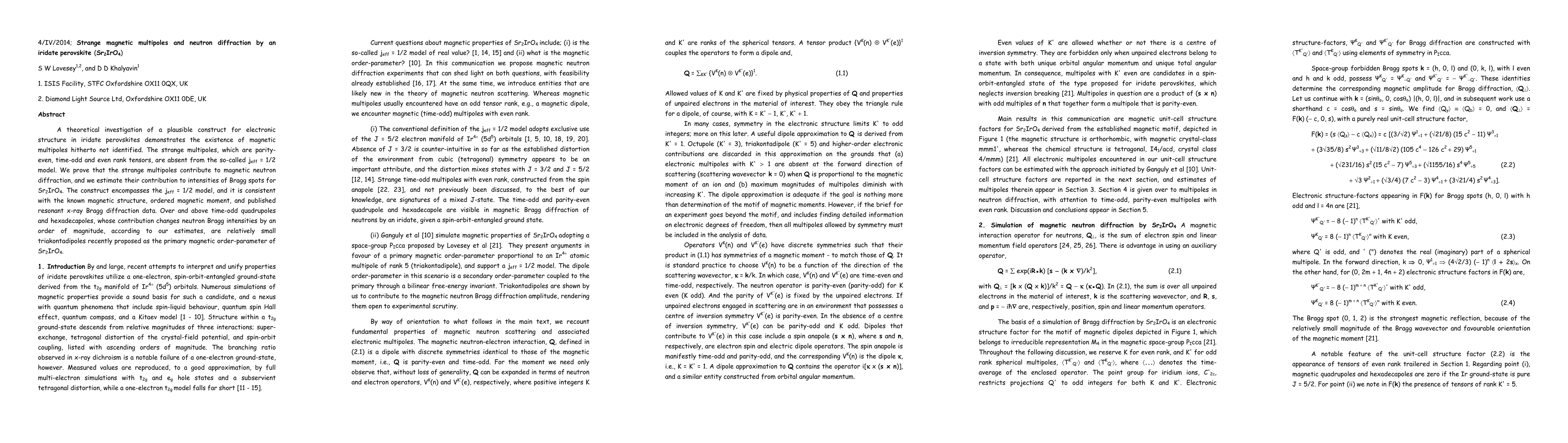 A theoretical investigation of a plausible construct for electronic structure in iridate perovskites demonstrates the existence of magnetic multipoles hitherto not identified. The strange multipoles, which are parity-even, time-odd and even rank tensors, are absent from the so-called jeff = 1/2 model. We prove that the strange multipoles contribute to magnetic neutron diffraction, and we estimate their contribution to intensities of Bragg spots for Sr2IrO4. The construct encompasses the jeff = 1/2 model, and it is consistent with the known magnetic structure, ordered magnetic moment, and published resonant x-ray Bragg diffraction data. Over and above time-odd quadrupoles and hexadecapoles, whose contribution changes neutron Bragg intensities by an order of magnitude, according to our estimates, are relatively small triakontadipoles recently proposed as the primary magnetic order-parameter of Sr2IrO4.