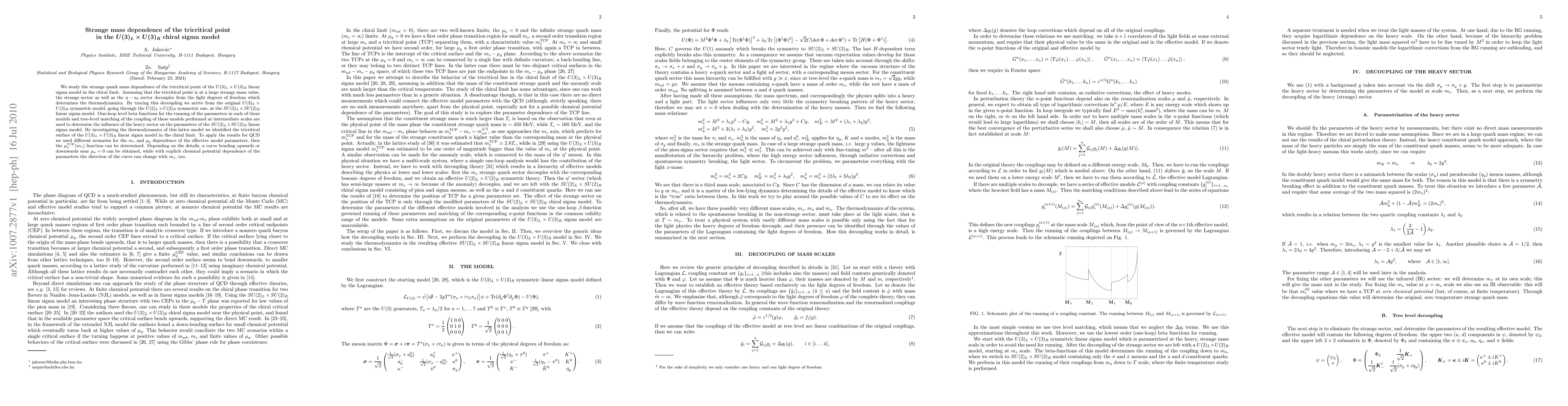 We study the strange quark mass dependence of the tricritical point of the U(3)_L x U(3)_R linear sigma model in the chiral limit. Assuming that the tricritical point is at a large strange mass value, the strange sector as well as the \eta-a_0 sector decouples from the light degrees of freedom which determines the thermodynamics. By tracing this decoupling we arrive from the original U(3)_L x U(3)_R symmetric model, going through the U(2)_L x U(2)_R symmetric one, at the SU(2)_L x SU(2)_R linear sigma model. One-loop level beta functions for the running of the parameters in each of these models and tree-level matching of the coupling of these models performed at intermediate scales are used to determine the influence of the heavy sector on the parameters of the SU(2)_L x SU(2)_R linear sigma model. By investigating the thermodynamics of this latter model we identified the tricritical surface of the U(3)_L x U(3)_R linear sigma model in the chiral limit. To apply the results for QCD we used different scenarios for the m_s and \mu_q dependence of the effective model parameters, then the \mu_q^TCP(m_s) function can be determined. Depending on the details, a curve bending upwards or downwards near \mu_q=0 can be obtained, while with explicit chemical potential dependence of the parameters the direction of the curve can change with m_s, too.