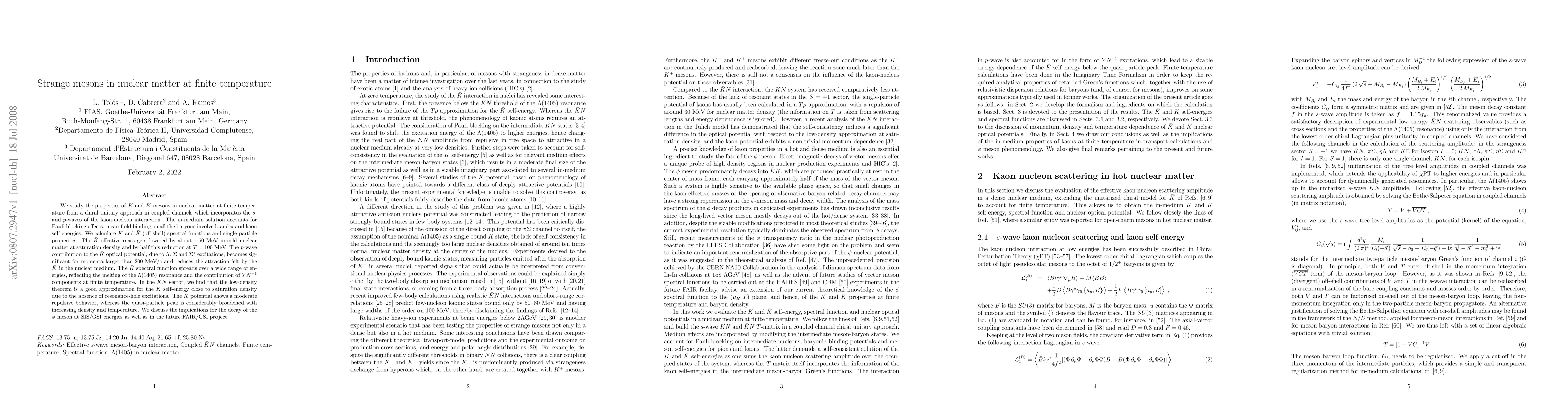 This study investigates the properties of $K$ and $\bar K$ mesons in nuclear matter at finite temperatures using a chiral unitary approach. It finds that the $\bar K$ effective mass decreases significantly in cold nuclear matter, with further reduction at higher temperatures, and the $\bar K$ spectral function broadens due to resonance melting and additional components.
