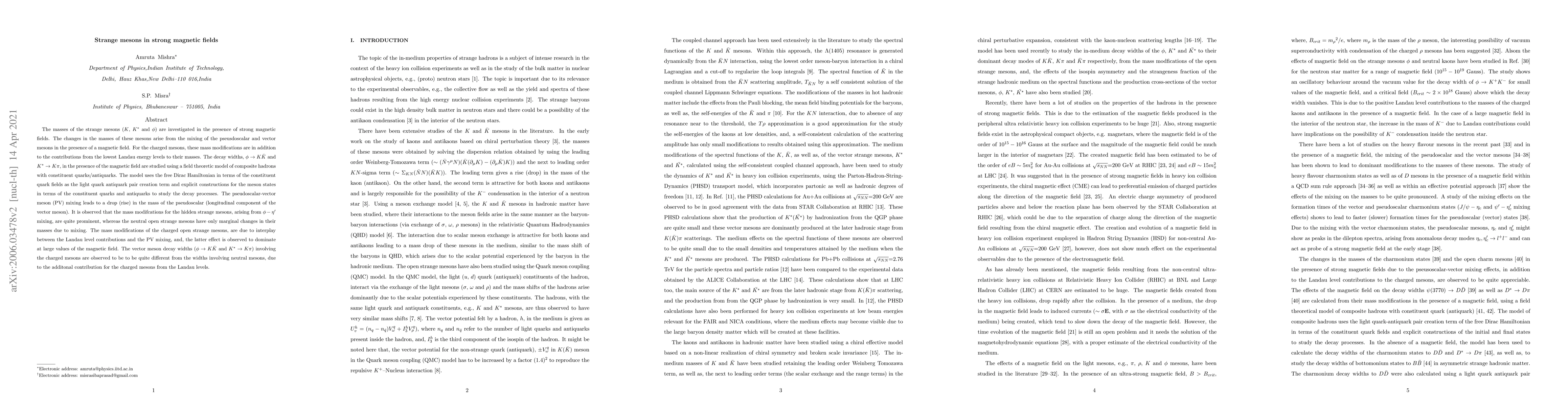 This paper investigates the mass modifications of strange mesons ($K$, $K^*$, and $\phi$) under strong magnetic fields, attributing changes to pseudoscalar-vector meson mixing and Landau energy contributions. It also examines decay widths using a field-theoretic model, suggesting potential observable effects on strange meson production in high-energy LHC collisions.