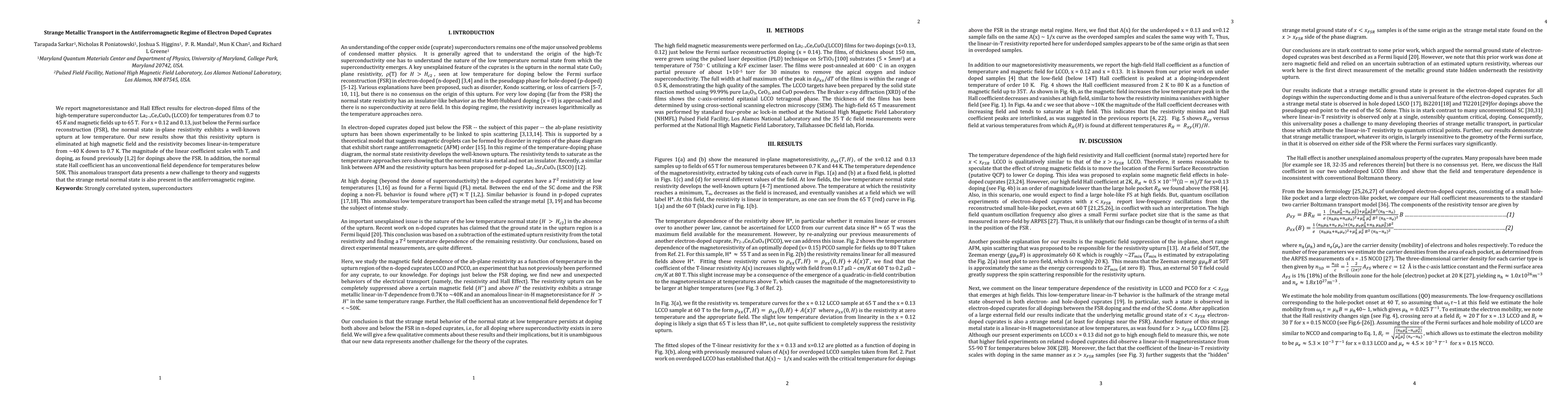We report magnetoresistance and Hall Effect results for electron-doped films of the high-temperature superconductor La$_{2-x}$Ce$_x$CuO$_4$ (LCCO) for temperatures from 0.7 to 45 K and magnetic fields up to 65 T. For x = 0.12 and 0.13, just below the Fermi surface reconstruction (FSR), the normal state in-plane resistivity exhibits a well-known upturn at low temperature. Our new results show that this resistivity upturn is eliminated at high magnetic field and the resistivity becomes linear-in-temperature from $\sim$ 40 K down to 0.7 K. The magnitude of the linear coefficient scales with Tc and doping, as found previously [1,2] for dopings above the FSR. In addition, the normal state Hall coefficient has an unconventional field dependence for temperatures below 50K. This anomalous transport data presents a new challenge to theory and suggests that the strange metal normal state is also present in the antiferromagnetic regime.