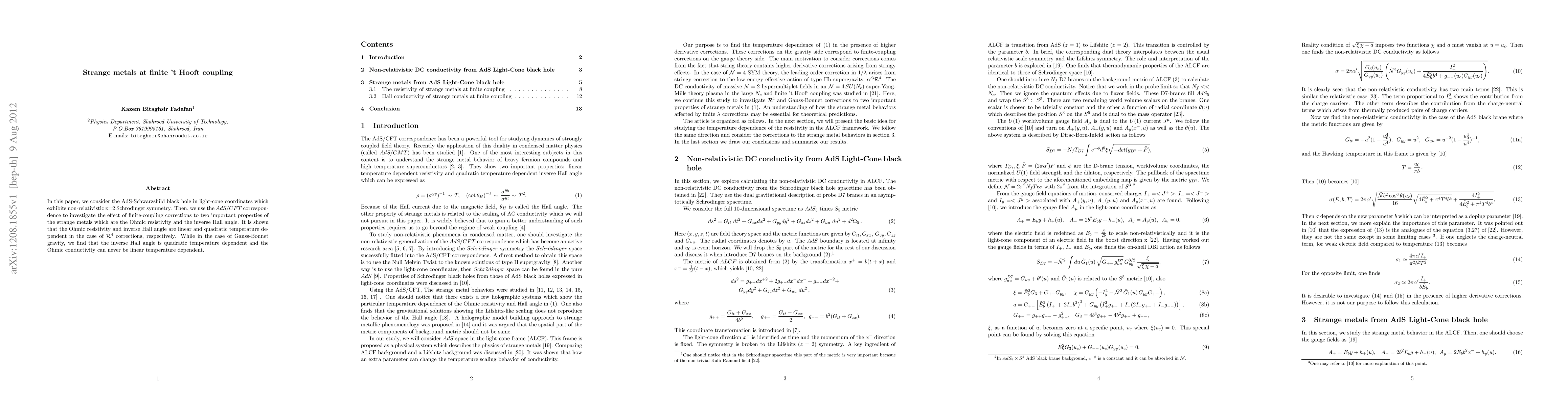 Research on AdS-Schwarzshild black holes reveals that finite 't Hooft coupling corrections affect the temperature-dependent properties of strange metals, including Ohmic resistivity and Hall angle.