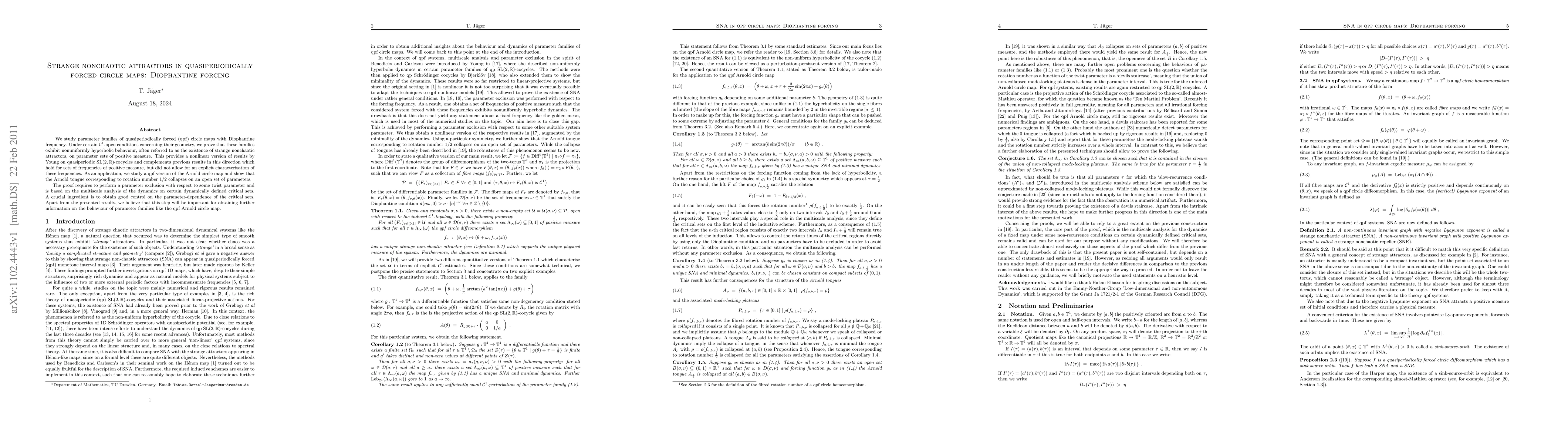 We study parameter families of quasiperiodically forced (qpf) circle maps with Diophantine frequency. Under certain C1-open conditions concerning their geometry, we prove that these families exhibit nonuniformly hyperbolic behaviour, often referred to as the existence of strange nonchaotic attractors, on parameter sets of positive measure. This provides a nonlinear version of results by Young on quasiperiodic SL (2;R)-cocycles and complements previous results in this direction which hold for sets of frequencies of positive measure, but did not allow for an explicit characterisation of these frequencies. As an application, we study a qpf version of the Arnold circle map and show that the Arnold tongue corresponding to rotation number 1/2 collapses on an open set of parameters. The proof requires to perform a parameter exclusion with respect to some twist parameter and is based on the multiscale analysis of the dynamics on certain dynamically defined critical sets. A crucial ingredient is to obtain good control on the parameter-dependence of the critical sets. Apart from the presented results, we believe that this step will be important for obtaining further information on the behaviour of parameter families like the qpf Arnold circle map.