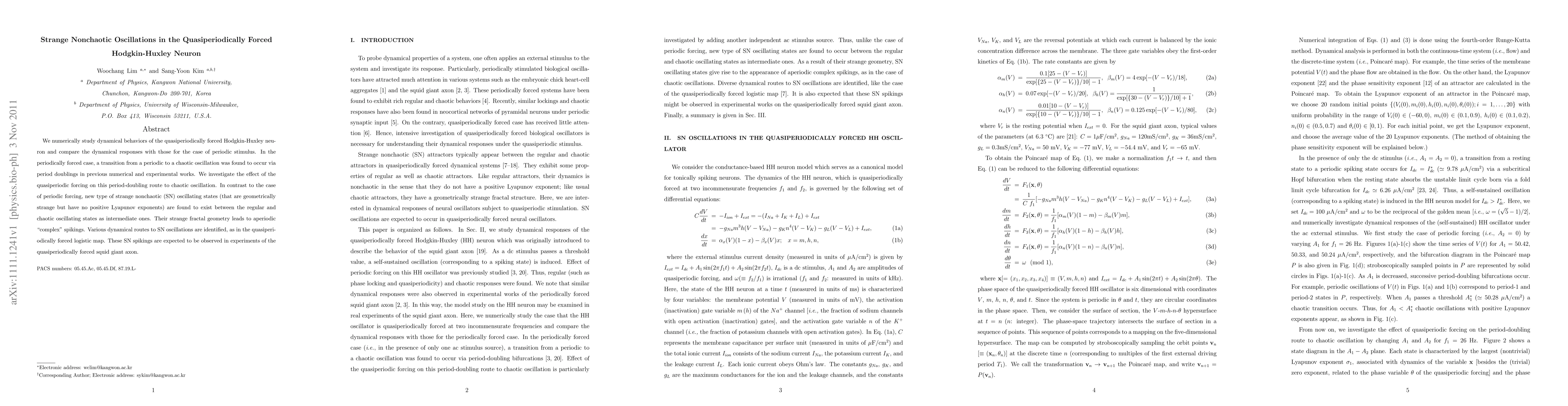 The paper presents a detailed numerical analysis of SN oscillations in the Hodgkin-Huxley neuron model under quasiperiodic forcing, identifying new dynamical routes and attractors not observed in periodic forcing cases.