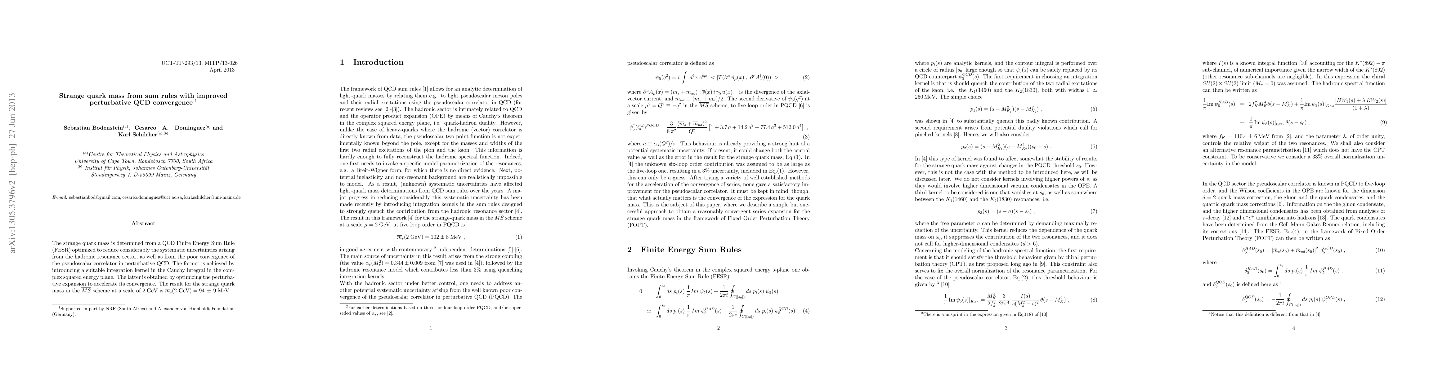 This paper determines the strange quark mass using QCD Finite Energy Sum Rules with improved perturbative QCD techniques to enhance convergence and reduce systematic uncertainties. The result is m_s(2 GeV) = (94 ± 9) MeV in the $\bar{MS}$ scheme.