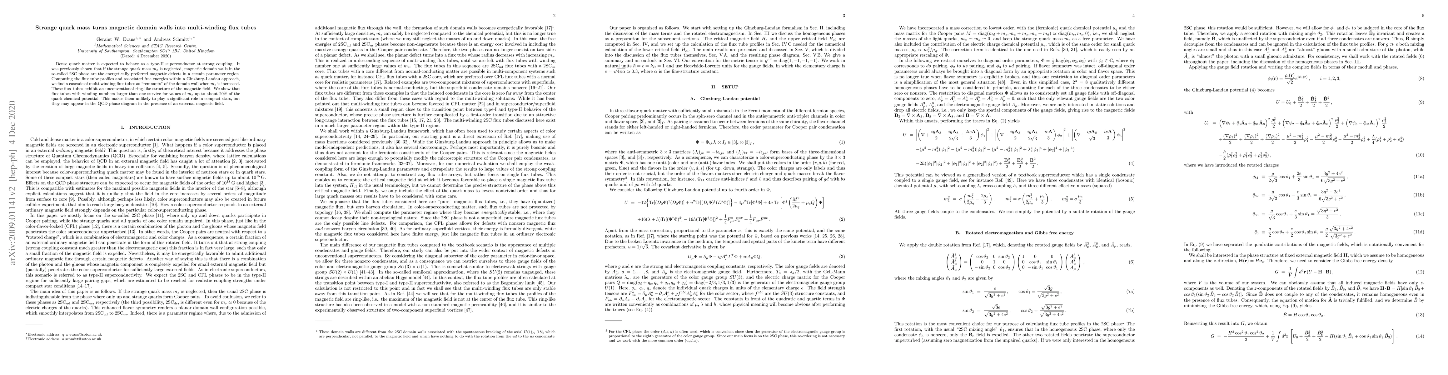 Dense quark matter is expected to behave as a type-II superconductor at strong coupling. It was previously shown that if the strange quark mass $m_s$ is neglected, magnetic domain walls in the so-called 2SC phase are the energetically preferred magnetic defects in a certain parameter region. Computing the flux tube profiles and associated free energies within a Ginzburg-Landau approach, we find a cascade of multi-winding flux tubes as "remnants" of the domain wall when $m_s$ is increased. These flux tubes exhibit an unconventional ring-like structure of the magnetic field. We show that flux tubes with winding numbers larger than one survive for values of $m_s$ up to about 20% of the quark chemical potential. This makes them unlikely to play a significant role in compact stars, but they may appear in the QCD phase diagram in the presence of an external magnetic field.