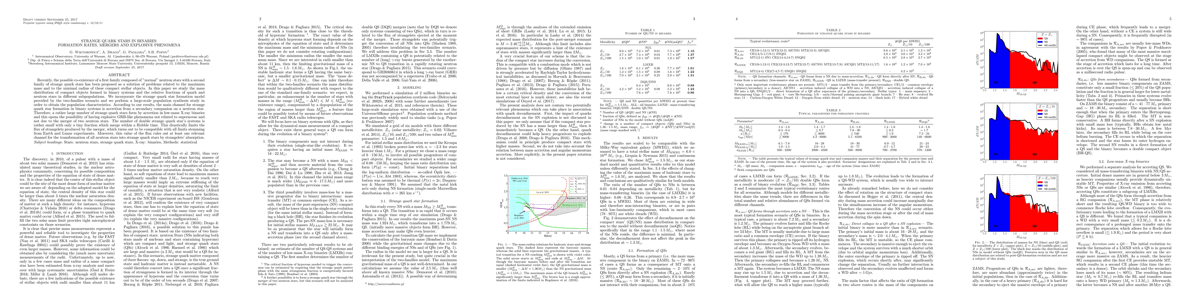 This research investigates the formation and merger rates of strange quark stars in binary systems and their explosive phenomena. It finds that the primary formation mechanism for strange quark stars in binaries is accretion from a companion neutron star, leading to potential GRB-like events without supernovae or neutron star mergers, while the merger rate of double strange quark star systems is low, consistent with observational limits on strangelet flux.