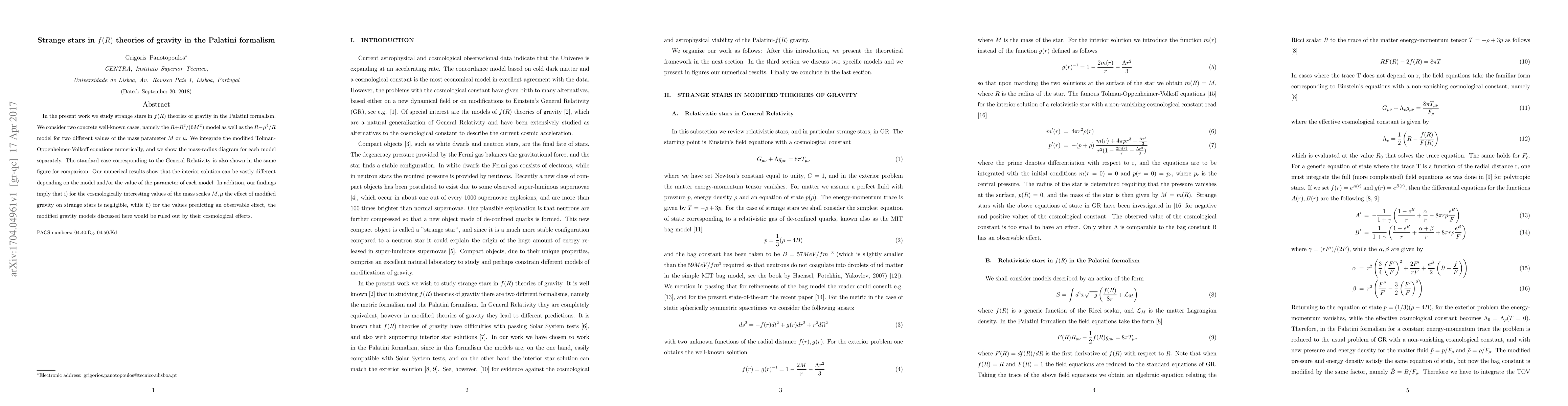 This paper investigates how alternative gravity theories affect strange stars, finding that for cosmologically interesting values of mass scales, the effects are negligible, while models predicting observable effects would be ruled out.