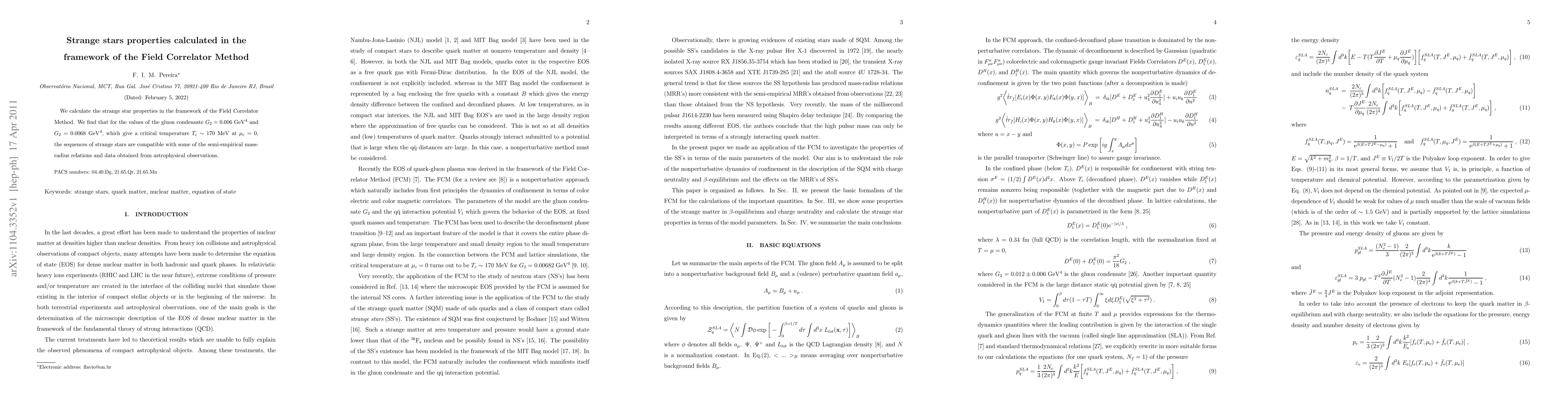 This paper calculates the properties of strange stars using the Field Correlator Method, finding that for specific gluon condensate values, the resulting sequences align with semi-empirical mass-radius relations and astrophysical data.