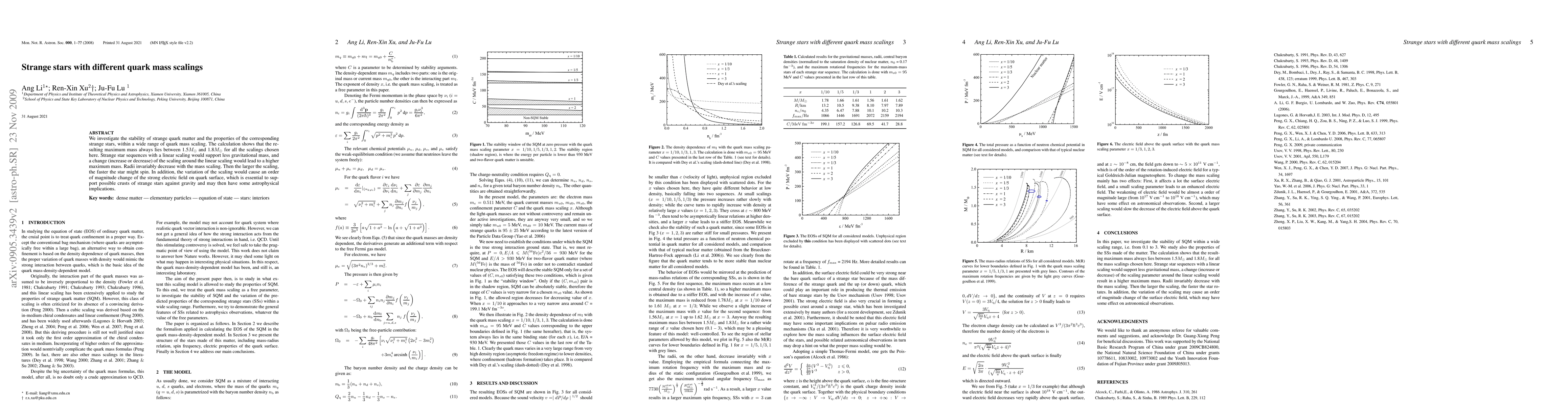This paper explores the stability and properties of strange stars under various quark mass scalings, finding that maximum masses range from 1.5 to 1.8 solar masses. Linear scaling supports less gravitational mass, while deviations lead to larger masses and smaller radii, with higher scalings potentially allowing faster rotation.