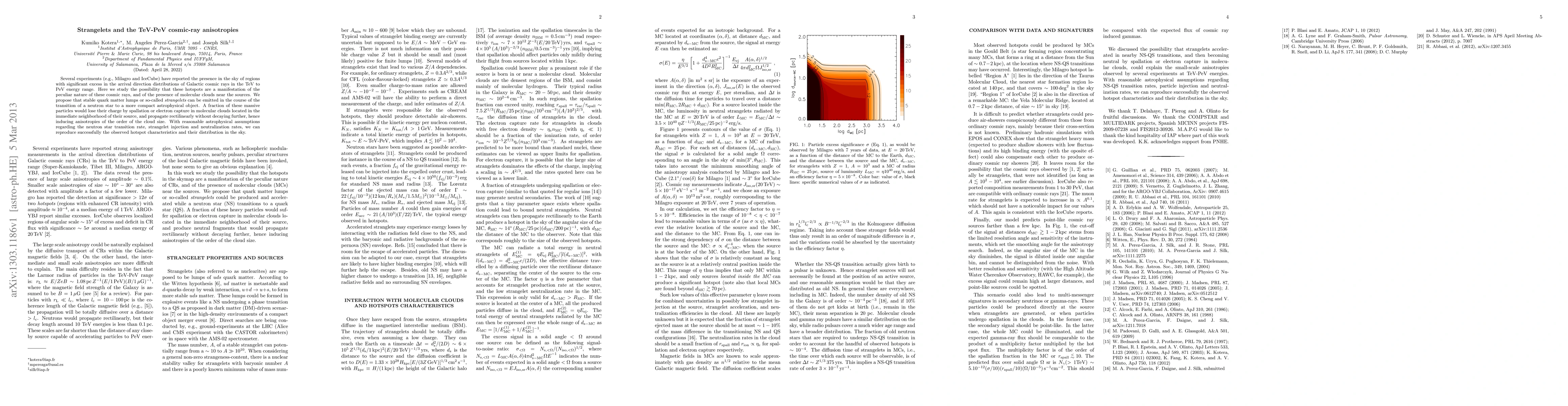 This paper explores the possibility that cosmic-ray anisotropies in the TeV to PeV range are due to "strangelets," stable quark matter lumps emitted during neutron star transitions. These strangelets can neutralize in nearby molecular clouds, propagating rectilinearly and inducing observed cosmic-ray hotspots.