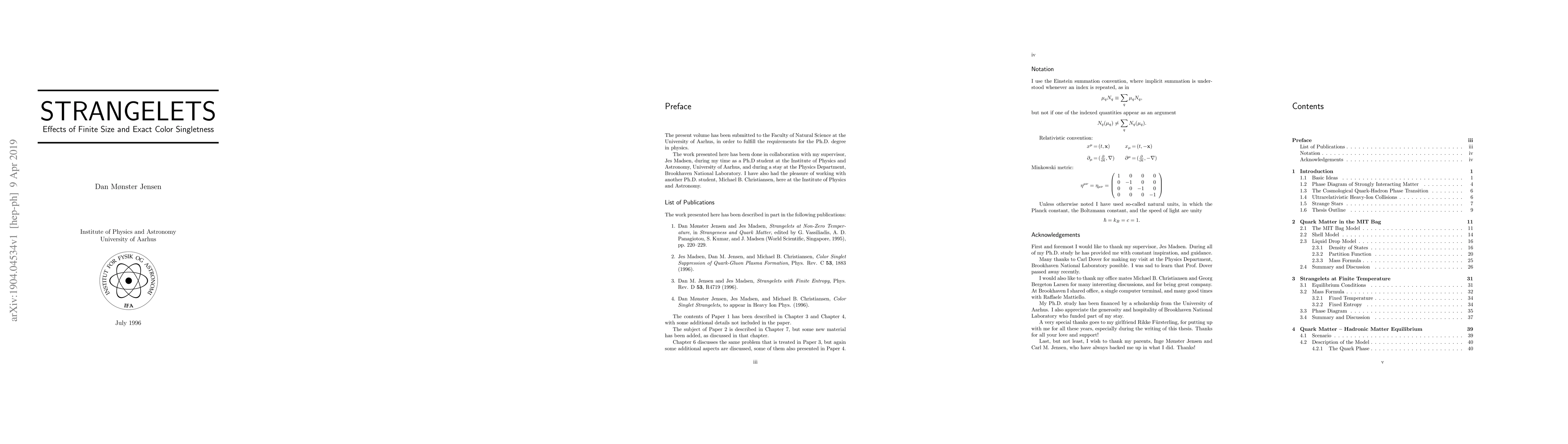 Matter consisting of up, down and strange quarks, socalled Strange Quark Matter, has been hypothesized to be stable in bulk, and conceivably stable or metastable in finite systems---strangelets---as an alternative state to ordinary baryonic matter. Strangelets, if they exist, may be relics from the hot and dense early universe, or they could be produced in high energy events, such as collisions of heavy nuclei at relativistic speeds. This thesis investigates the implications of various effects that affects the possible (meta-) stability of strangelets, such as finite size, distribution of quark states (shell model), interaction with a hadron gas, non-zero temperature and QCD constraints of color singletness of the wave function. These effects are studied within the phenomenological MIT bag model of quark matter using the multiple reflection expansion for a liquid drop model equation of state with comparison to a shell model. Finite size, non-zero temperature and color singlet constraints have a destabilizing effect on strangelets, and can suppress their production in heavy ion collisions. The work presented has been described in part in the following publications: Dan M{\o}nster Jensen and Jes Madsen, Strangelets at Non-Zero Temperature, in Strangeness and Quark Matter, edited by G. Vassiliadis, A. D. Panagiotou, S. Kumar, and J. Madsen (World Scientific, Singapore, 1995), pp. 220--229. Jes Madsen, Dan M. Jensen, and Michael B. Christiansen, Color Singlet Suppression of Quark-Gluon Plasma Formation, Phys. Rev. C 53, 1883 (1996). Dan M. Jensen and Jes Madsen, Strangelets with Finite Entropy, Phys. Rev. D 53, R4719 (1996). Dan M{\o}nster Jensen, Jes Madsen, and Michael B. Christiansen, Color Singlet Strangelets, Heavy Ion Phys. 4 (1-4), 387-394 (1996).