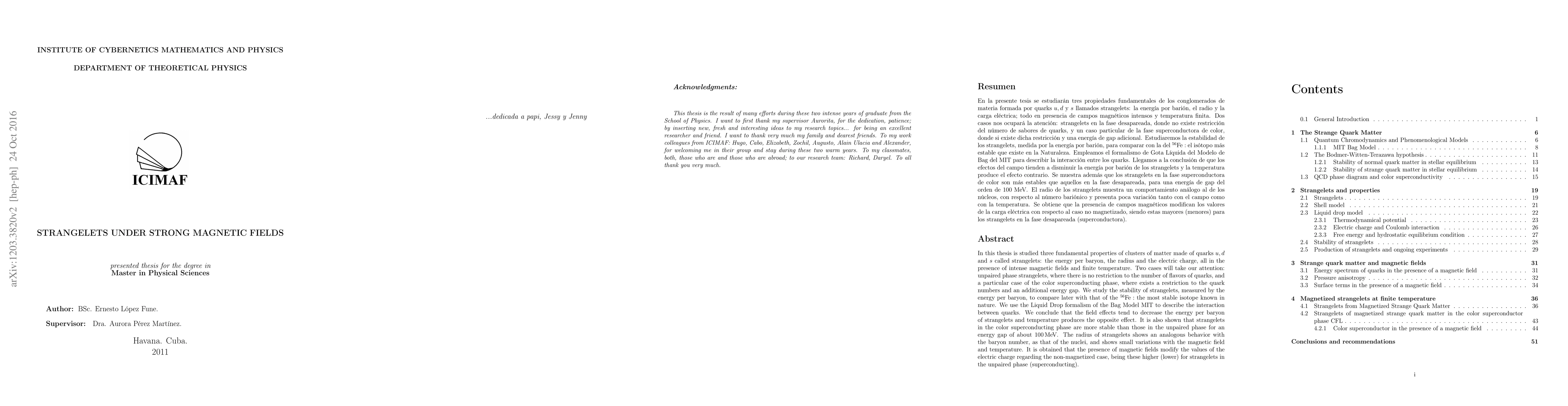 In this thesis is studied three of the fundamental properties of clusters of matter made of quarks u, d and s called strangelets: the energy per baryon, the radius and the electric charge, all in the presence of intense magnetic fields and finite temperature. Two cases will take our attention: unpaired phase strangelets, where there is no restriction to the number of flavors of quarks, and a particular case of the color superconducting phase, where exists a restriction to the quark numbers and an additional energy gap. We study the stability of strangelets, measured by the energy per baryon, to compare later with that of the 56Fe : the most stable isotope known in nature. We employ the Liquid Drop formalism of the Bag Model MIT to describe the interaction between quarks. We conclude that the field effects tend to decrease the energy per baryon of strangelets and temperature produces the opposite effect. It is also shown that strangelets in the color superconducting phase are more stable than those in the unpaired phase for an energy gap of about 100MeV. The radius of strangelets shows an analogous behavior with the baryon number, as that of the nuclei, and shows small variations with the magnetic field and temperature. It is obtained that the presence of magnetic fields modify the values of the electric charge regarding the non-magnetized case, being these higher (lower) for strangelets in the unpaired phase (superconducting).