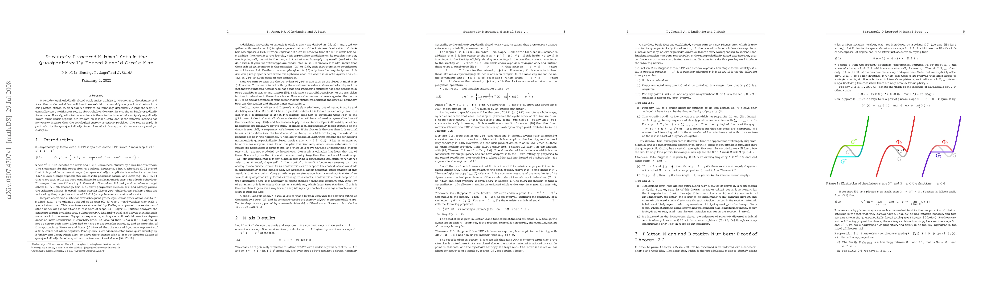 We study quasiperiodically forced circle endomorphisms, homotopic to the identity, and show that under suitable conditions these exhibit uncountably many minimal sets with a complicated structure, to which we refer to as `strangely dispersed'. Along the way, we generalise some well-known results about circle endomorphisms to the uniquely ergodically forced case. Namely, all rotation numbers in the rotation interval of a uniquely ergodically forced circle endomorphism are realised on minimal sets, and if the rotation interval has non-empty interior then the topological entropy is strictly positive. The results apply in particular to the quasiperiodically forced Arnold circle map, which serves as a paradigm example.