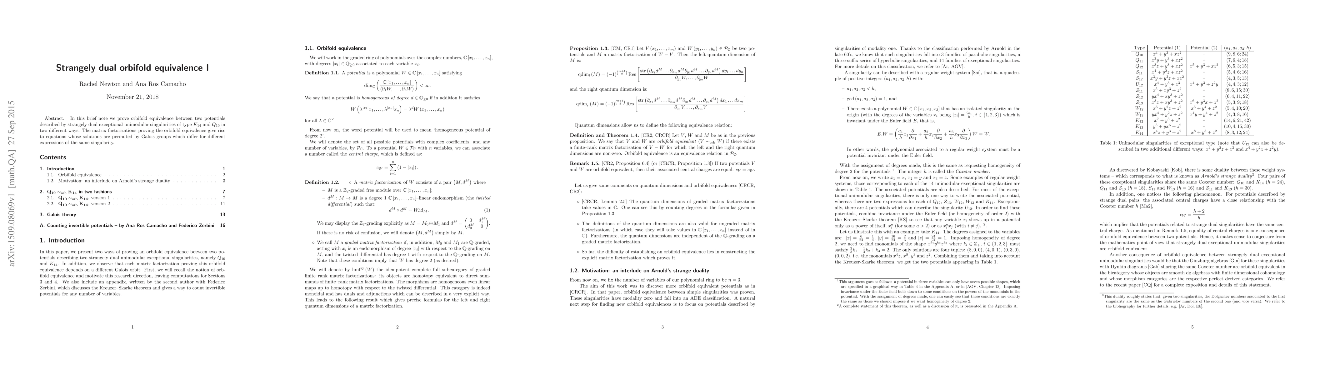 In this brief note we prove orbifold equivalence between two potentials described by strangely dual exceptional unimodular singularities of type $K_{14}$ and $Q_{10}$ in two different ways. The matrix factorizations proving the orbifold equivalence give rise to equations whose solutions are permuted by Galois groups which differ for different expressions of the same singularity.