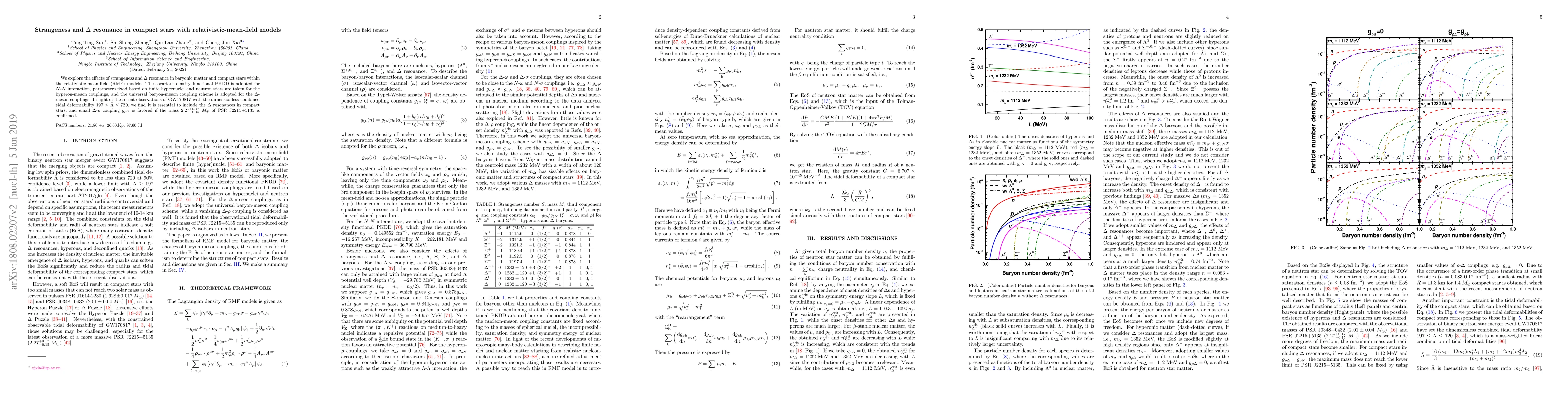 We explore the effects of strangeness and $\Delta$ resonance in baryonic matter and compact stars within the relativistic-mean-field (RMF) models. The covariant density functional PKDD is adopted for $N$-$N$ interaction, parameters fixed based on finite hypernuclei and neutron stars are taken for the hyperon-meson couplings, and the universal baryon-meson coupling scheme is adopted for the $\Delta$-meson couplings. In light of the recent observations of GW170817 with the dimensionless combined tidal deformability $197 \leq \bar{\Lambda}\leq 720$, we find it is essential to include the $\Delta$ resonances in compact stars, and small $\Delta$-$\rho$ coupling $g_{\rho \Delta}$ is favored if the mass $2.27{}_{-0.15}^{+0.17}\ M_\odot$ of PSR J2215+5135 is confirmed.
