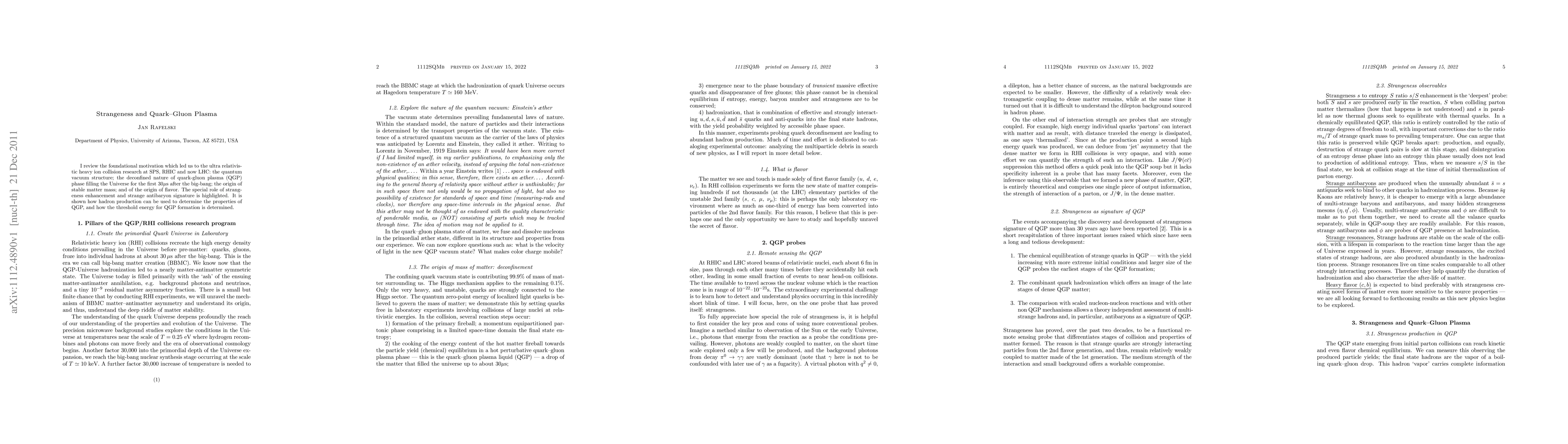 I review the foundational motivation which led us to the ultra relativistic heavy ion collision research at SPS, RHIC and now LHC: the quantum vacuum structure; the deconfined nature of quark-gluon plasma (QGP) phase filling the Universe for the first 30$\mu$s after the big-bang; the origin of stable matter mass; and of the origin of flavor. The special role of strangeness enhancement and strange antibaryon signature is highlighted. It is shown how hadron production can be used to determine the properties of QGP, and how the threshold energy for QGP formation is determined.