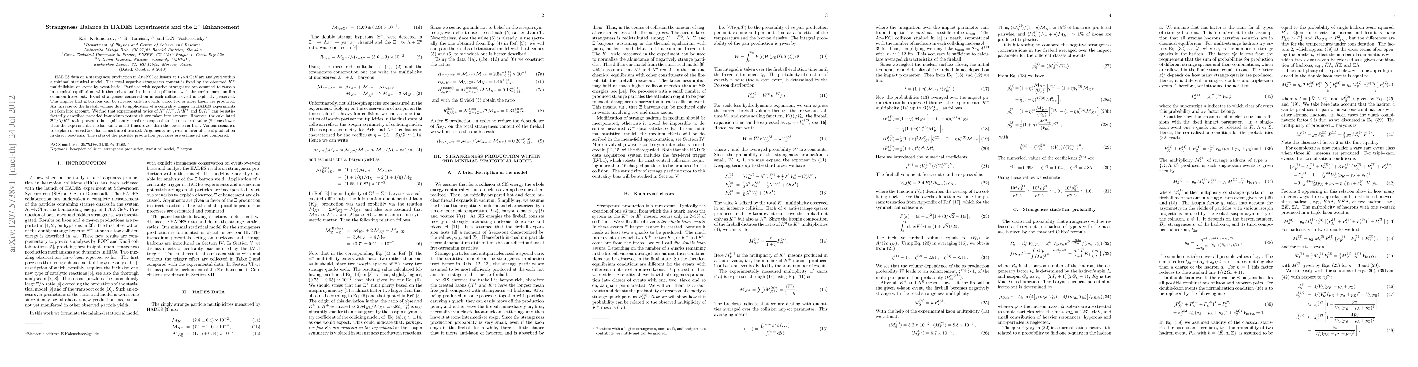 HADES data on a strangeness production in Ar+KCl collisions at 1.76A GeV are analyzed within a minimal statistical model. The total negative strangeness content is fixed by the observed K^+ multiplicities on event-by-event basis. Particles with negative strangeness are assumed to remain in chemical equilibrium with themselves and in thermal equilibrium with the environment until a common freeze-out. Exact strangeness conservation in each collision event is explicitly preserved. This implies that Xi baryons can be released only in events where two or more kaons are produced. An increase of the fireball volume due to application of a centrality trigger in HADES experiments is taken into account. We find that experimental ratios of K-/K+, Lambda/K+ and Sigma/K+ can be satisfactorily described provided in-medium potentials are taken into account. However, the calculated Xi-/Lambda/K+ ratio proves to be significantly smaller compared to the measured value (8 times lower than the experimental median value and 3 times lower than the lower error bar). Various scenarios to explain observed Xi enhancement are discussed. Arguments are given in favor of the Xi production in direct reactions. The rates of the possible production processes are estimated and compared.