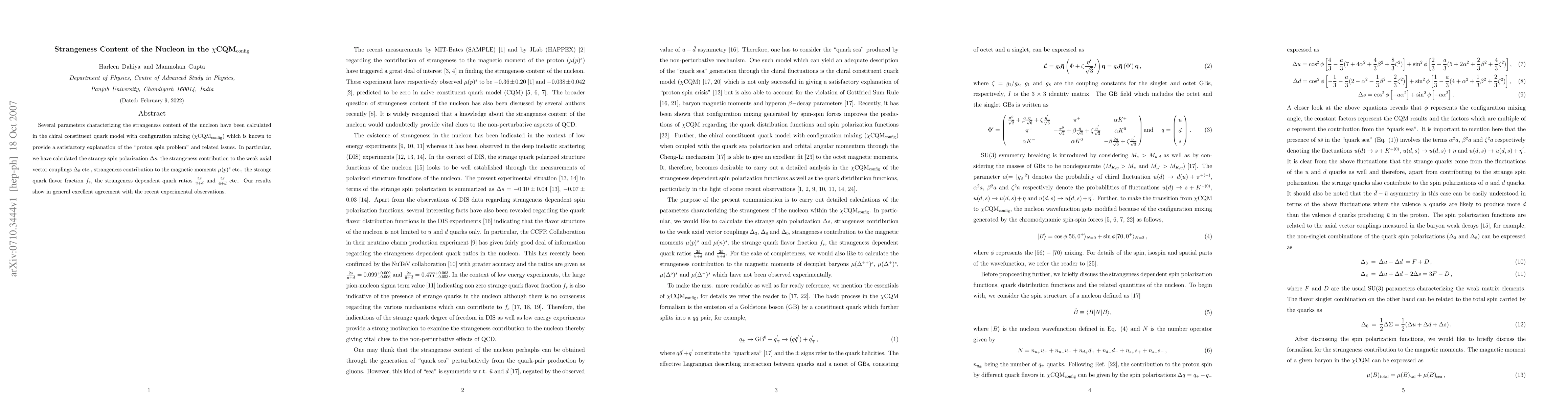 This paper calculates various parameters characterizing the strangeness content of the nucleon using the chiral constituent quark model with configuration mixing (\chiCQM_{config}). The results show excellent agreement with recent experimental observations, addressing the proton spin problem and related issues.