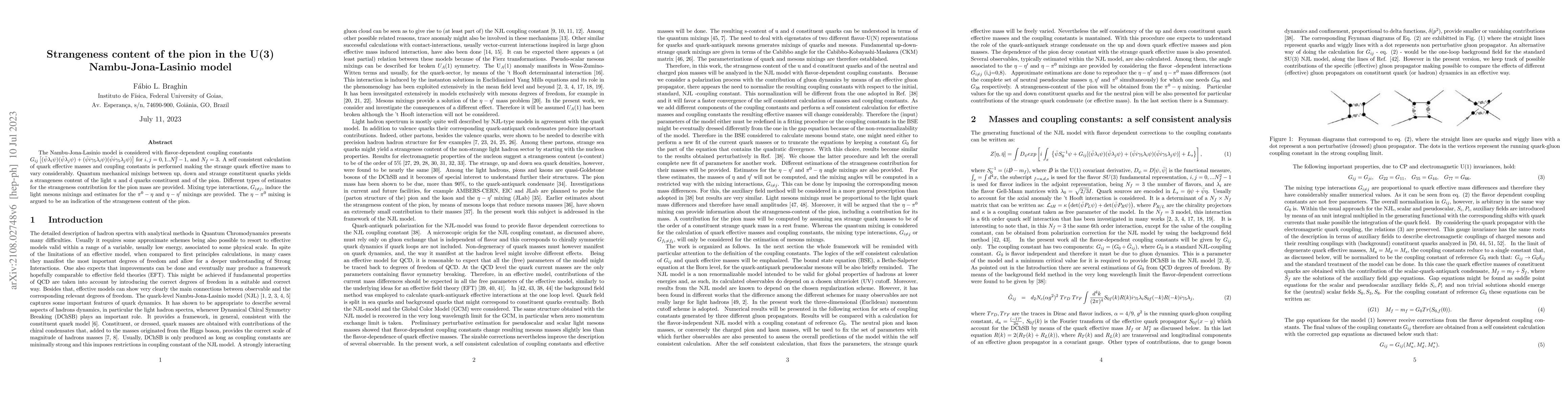 The Nambu-Jona-Lasinio model is considered with flavor-dependent coupling constants $G_{ij} \left[ ( \bar{\psi} \lambda_i \psi ) ( \bar{\psi} \lambda_j \psi )+ ( \bar{\psi} i\gamma_5 \lambda_i \psi ) ( \bar{\psi} i \gamma_5\lambda_j \psi )\right]$ for $i,j=0,1..N_f^2-1$, and $N_f=3$. A self consistent calculation of quark effective masses and coupling constants is performed making the strange quark effective mass to vary considerably. Quantum mechanical mixings between up, down and strange constituent quarks yields a strangeness content of the light u and d quarks constituent and of the pion. Different types of estimates for the strangeness contribution for the pion mass are provided. Mixing type interactions, $G_{i\neq j}$, induce the light mesons mixings and estimates for the $\pi^0-\eta$ and $\eta-\eta'$ mixings are provided. The $\eta-\pi^0$ mixing is argued to be an indication of the strangeness content of the pion.
