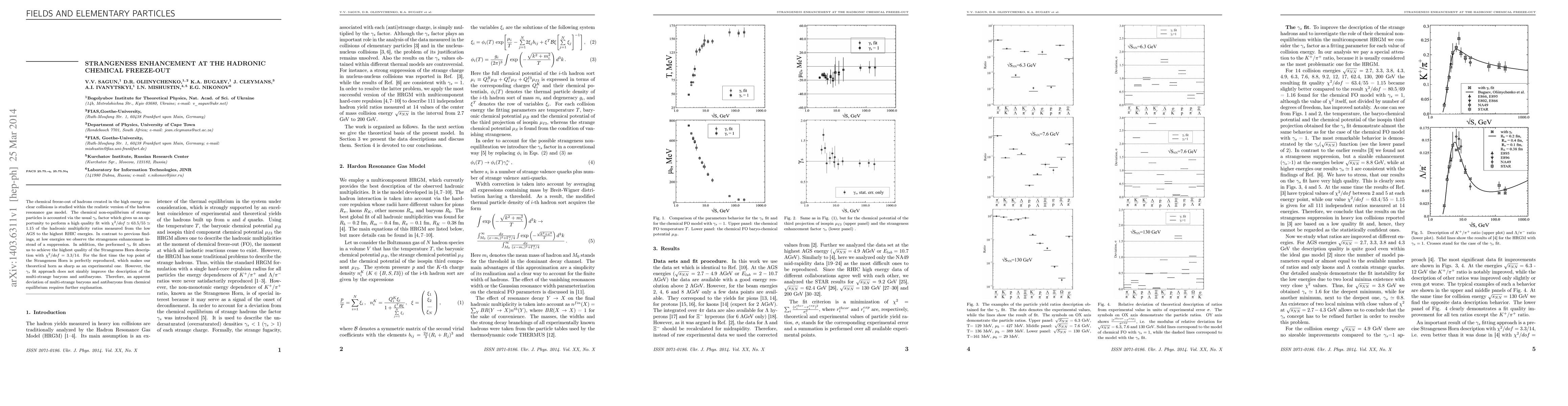 Researchers studied hadronic chemical freeze-out in high-energy nuclear collisions using a realistic model, finding that strange particles exhibit enhancement instead of suppression at low energies, with improved fit results for the Strangeness Horn description.